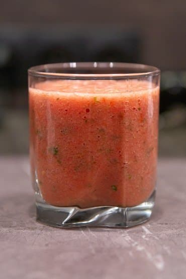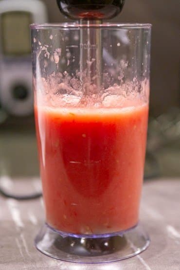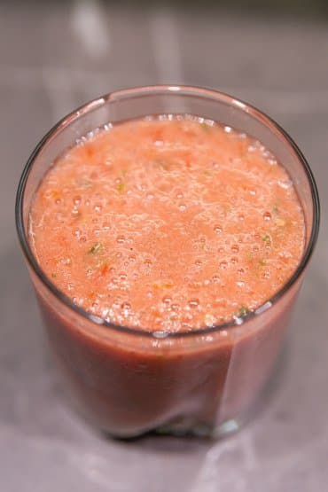 В густой массе всё еще были видны крупные кусочки шкурки, и для верности мы включили блендер еще на 20 секунд, а в завершении добили помидоры несколькими запусками режима Турбо по паре секунд каждый. В результате шкурки стали значительно меньше, семена частично перемололись, сама масса получилась достаточно воздушной.