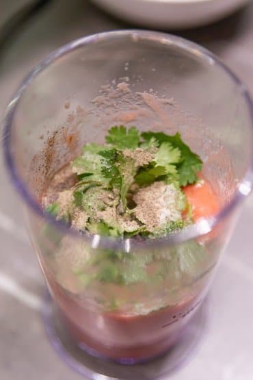 В полученную томатную массу мы добавили кинзу, соль с черным молотым перцем и еще раз включили мотор. На измельчение листьев и смешивание на этот раз ушло всего 10 секунд.