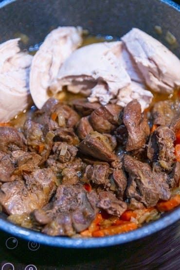 В чашу измельчителя поместили первую половину продуктов: заранее поджаренную с морковью и луком куриную печень, отварную куриную грудку и сливочное масло комнатной температуры. Сверху присыпали солью, мускатным орехом и горсткой измельченных грецких орехов из предыдущего теста.