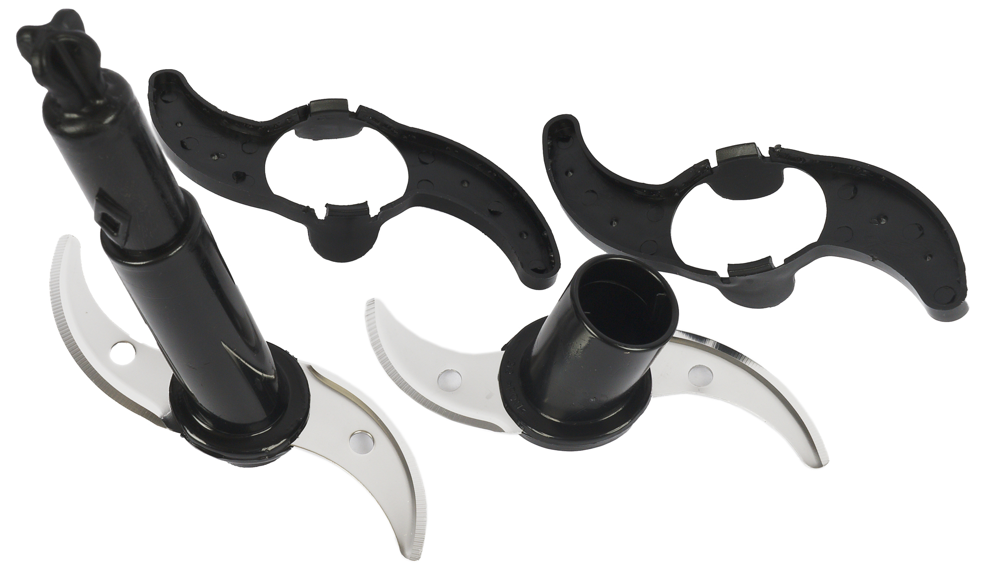 На металлический штырь на дне устанавливаются S-образные лезвия для измельчения. Для безопасного хранения для них предусмотрены пластиковые чехлы.