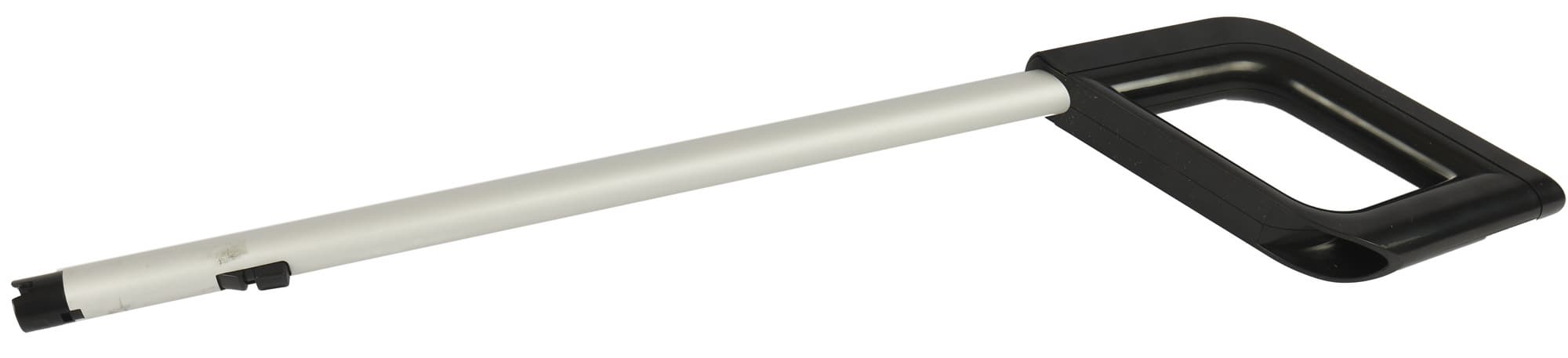 Для уборки пола предназначена удлинительная трубка с D-образной рукояткой. На торце ручки мы видим разъем для подключения к зарядному устройству. А вот органов управления здесь нет — чтобы включить или выключить прибор в напольной конфигурации, необходимо нагнуться к моторному блоку.