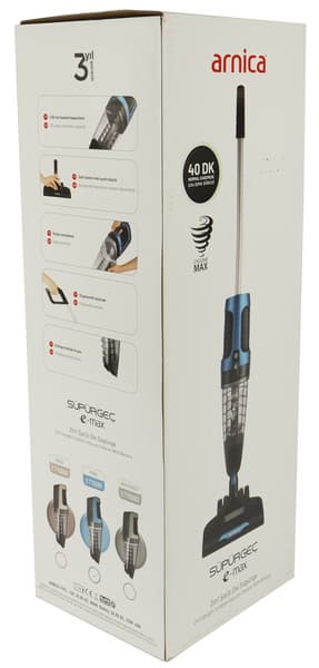 Аккумуляторный пылесос Arnica E-Max ET11201 поставляется в белой картонной коробке с полноцветной печатью. Помимо изображений устройства в действии, на упаковке производитель приводит краткие технические характеристики и перечисляет основные особенности модели.