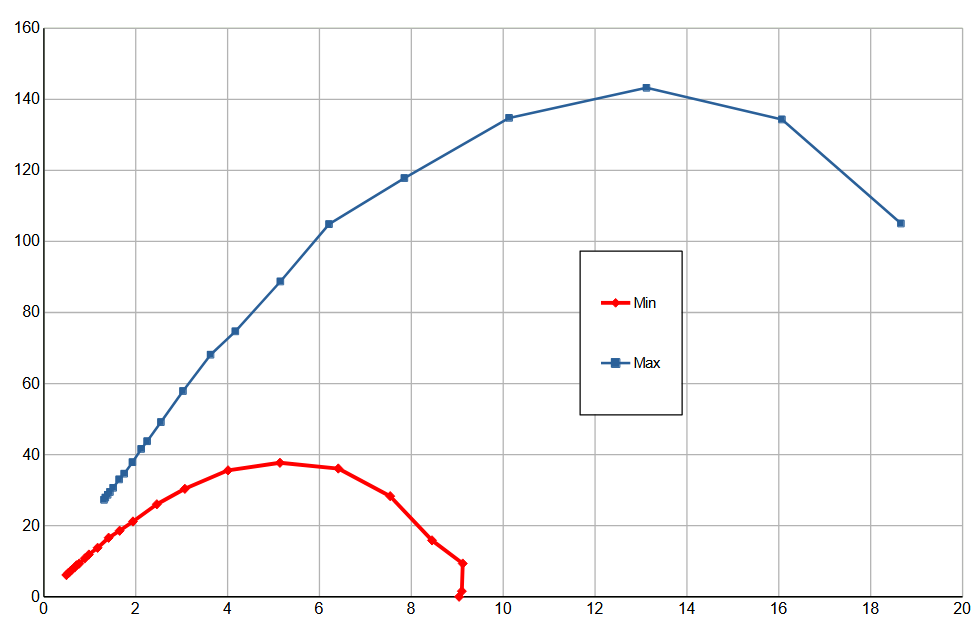 Мощность всасывания (что это такое и как мы ее измеряем, описано в отдельной статье) мы определяли при работе пылесоса без трубы и насадок, в двух режимах. Зависимость мощности всасывания от создаваемого разрежения приведена на графике ниже: