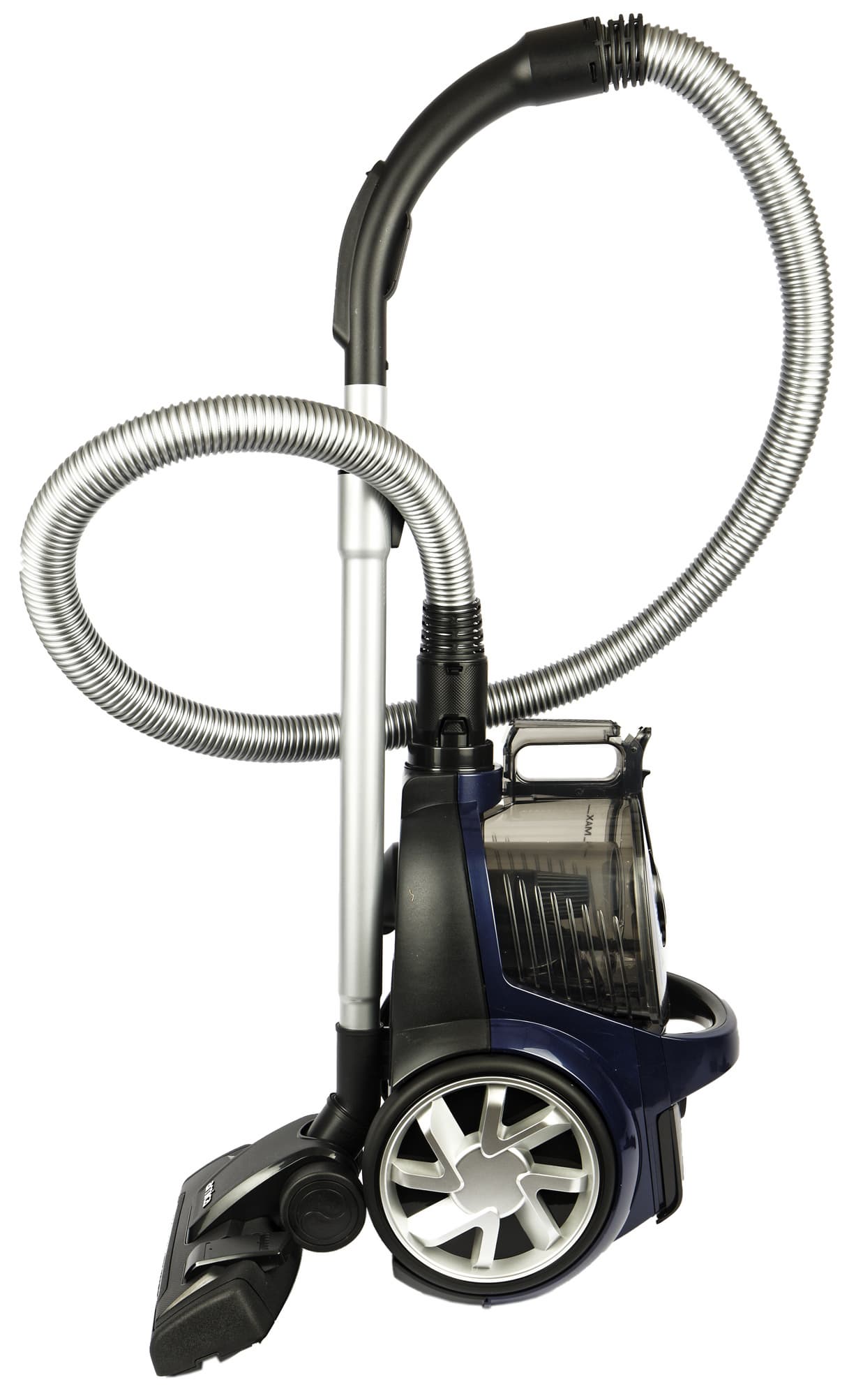 Сине-черный корпус пылесоса сделан из глянцевого пластика.