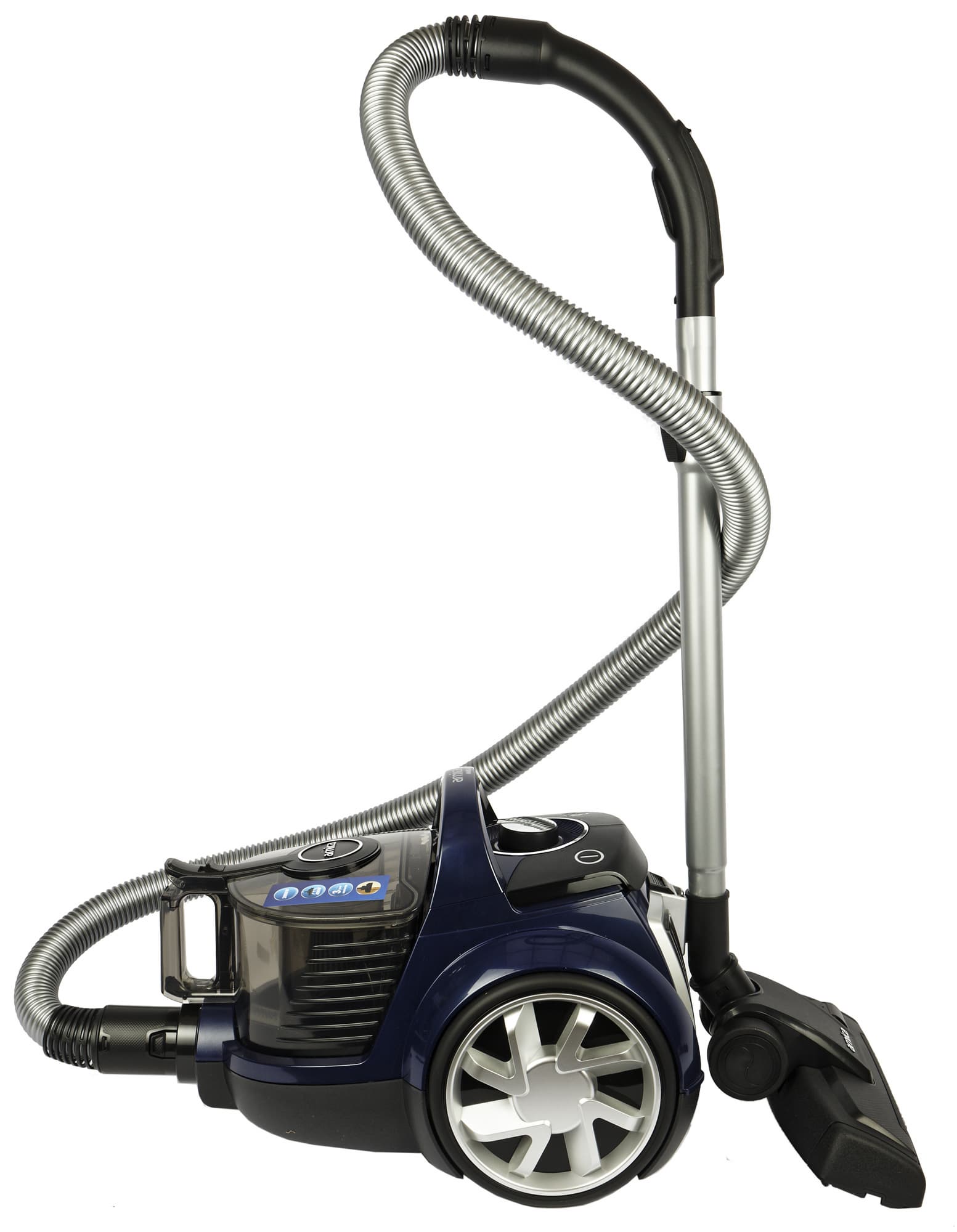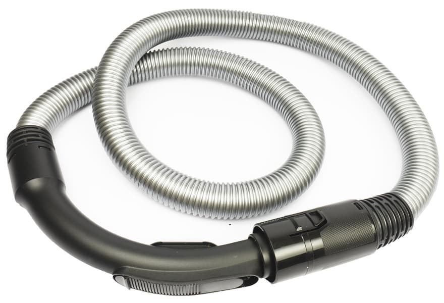 Серебристый пластиковый гофрированный шланг длиной около 2 метров снабжен пластиковой шторкой: у этой модели есть как электронная, так и механическая регулировка мощности всасывания.