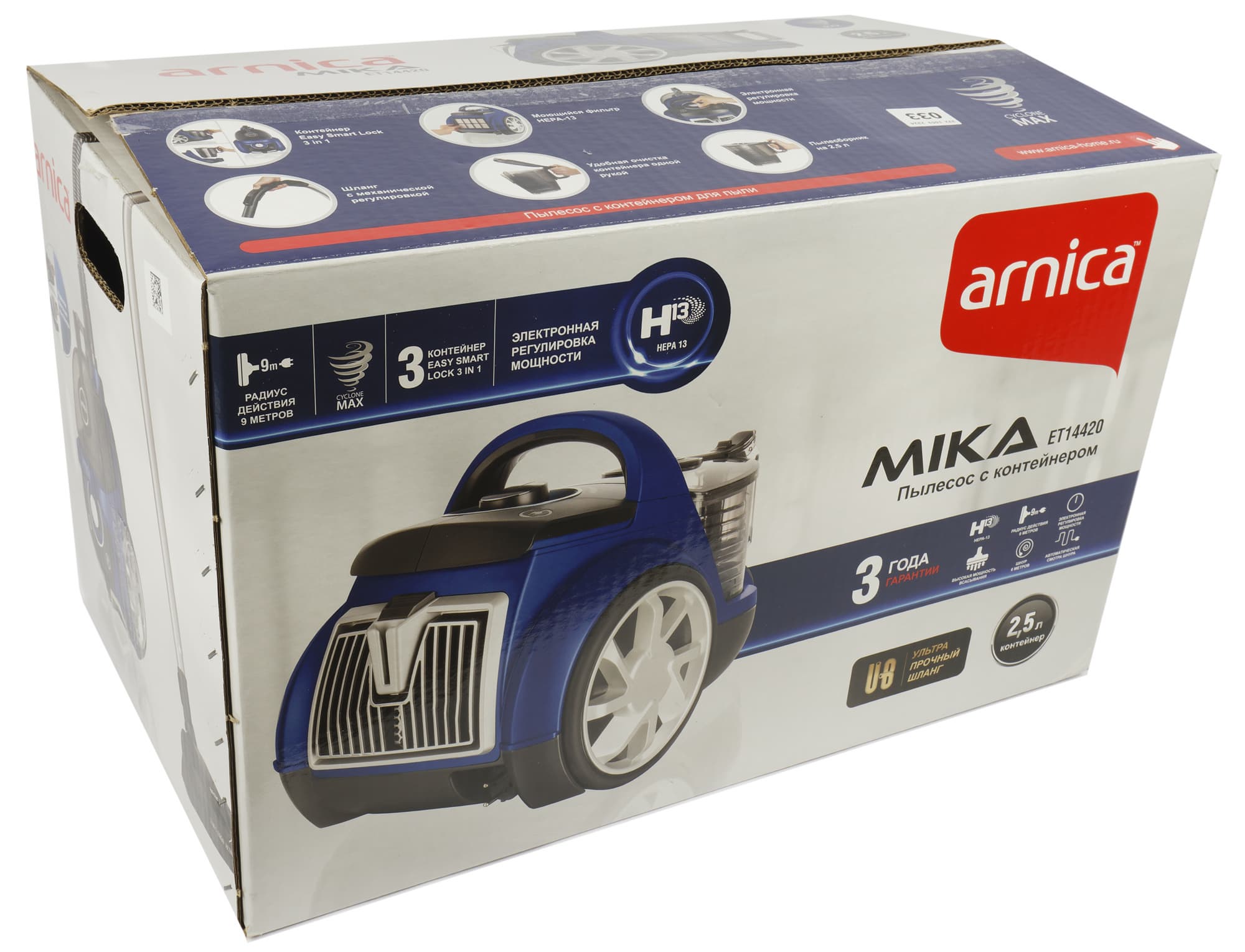 Пылесос упакован в большую картонную коробку с полноцветной печатью. На верхней и боковых сторонах можно видеть изображение прибора, которое производитель дополняет перечислением основных отличительных особенностей. Среди них — электронная регулировка мощности, удобная очистка контейнера (его емкость составляет 2,5 л), моющийся HEPA-фильтр класса H13, большой (9 метров) радиус действия и ультрапрочный шланг.