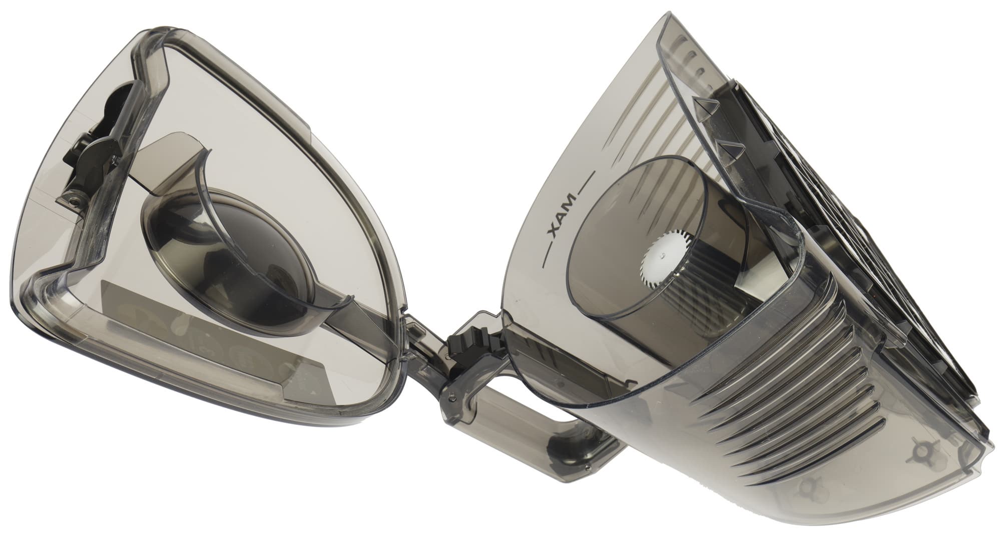 Передняя половина корпуса — съемный мусоросборник из темного полупрозрачного пластика. Внутри у него наклейка с картинками, которые объясняют процесс опустошения емкости и ухода за ней.