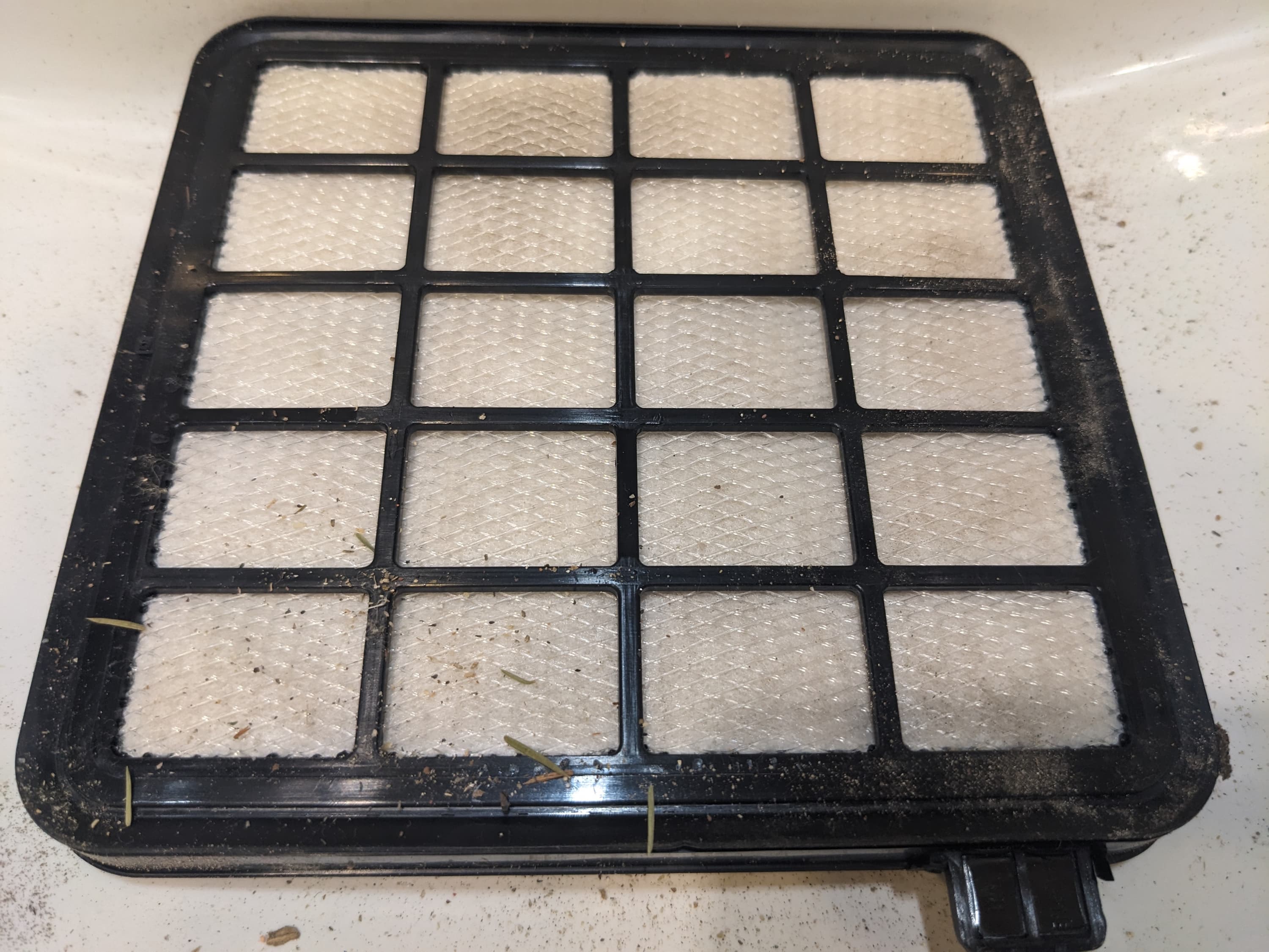 Он находится под съемной решеткой и представляет собой ребристый HEPA-элемент, закрепленный на пластиковой рамке.