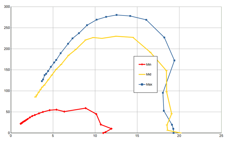 При полностью закрытой задвижке стенда на средней и максимальной мощности срабатывает защита от перегрева, и прибор выключается: это можно видеть на желтом и синем графиках.