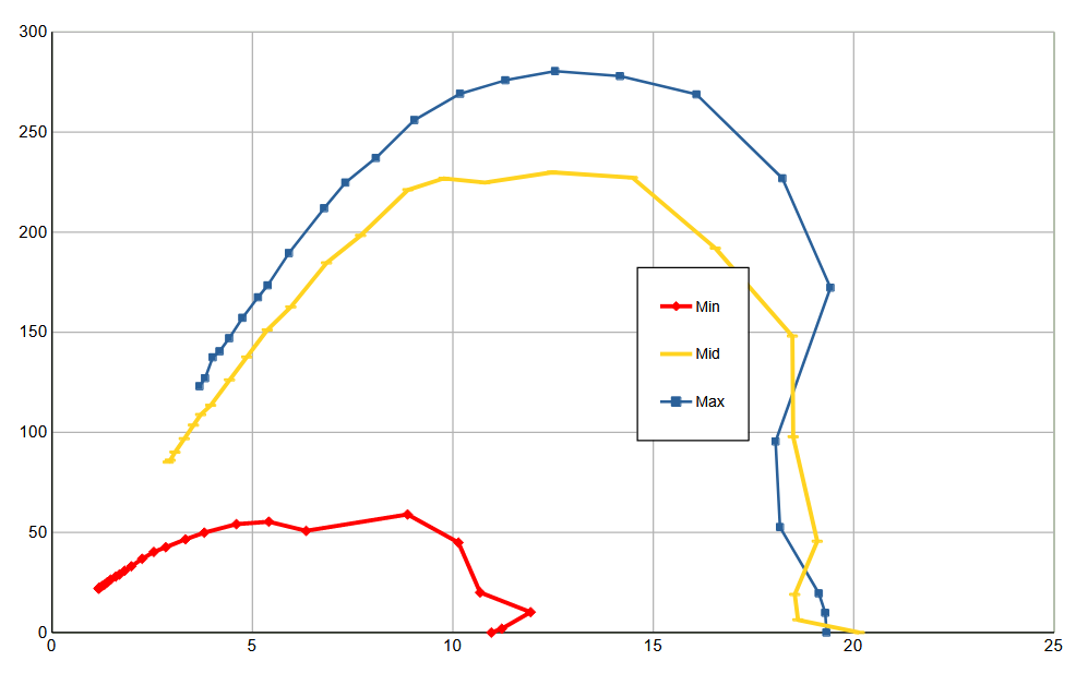 Мощность всасывания (что это такое и как мы ее измеряем, описано в отдельной статье) мы определяли при работе пылесоса без трубы и насадок, в трех режимах. Зависимость мощности всасывания от создаваемого разрежения приведена на графике ниже: