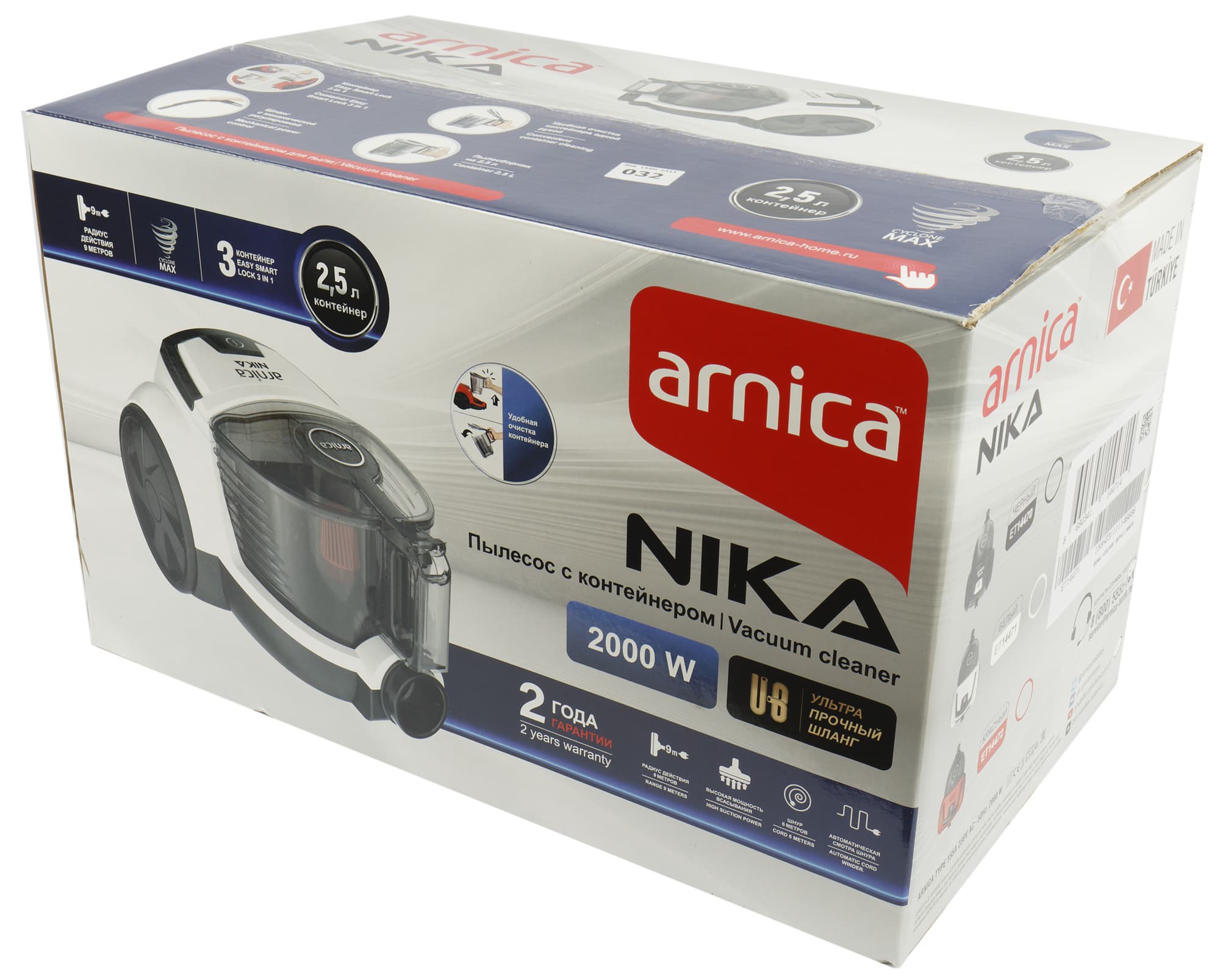 Пылесос упакован в большую картонную коробку с полноцветной печатью. На верхней и боковых сторонах можно видеть изображение прибора, которое производитель дополняет перечислением основных отличительных особенностей модели. Среди них — высокая мощность всасывания, удобная очистка контейнера (его емкость составляет 2,5 л), большой (9 метров) радиус действия и ультрапрочный шланг.