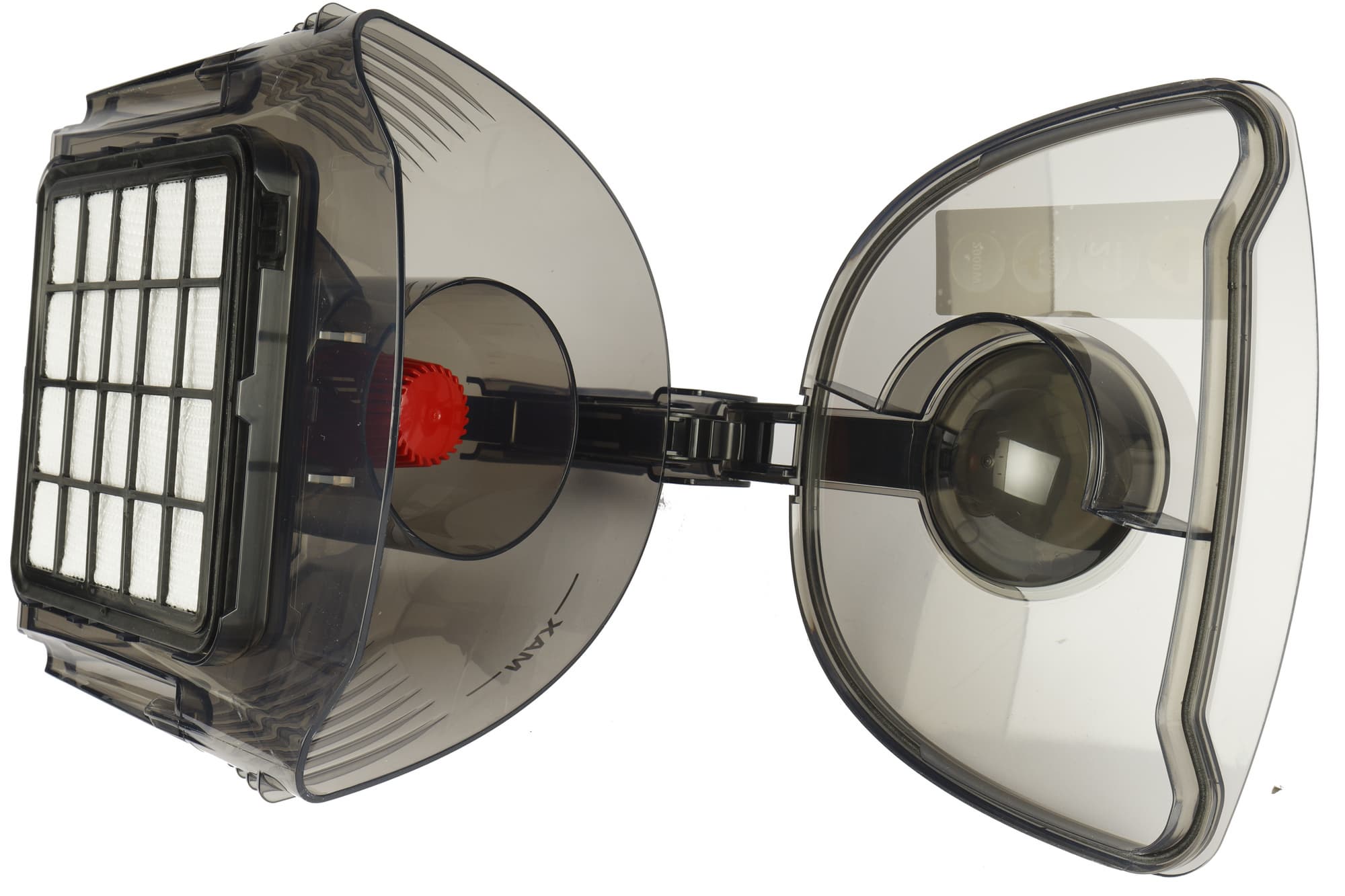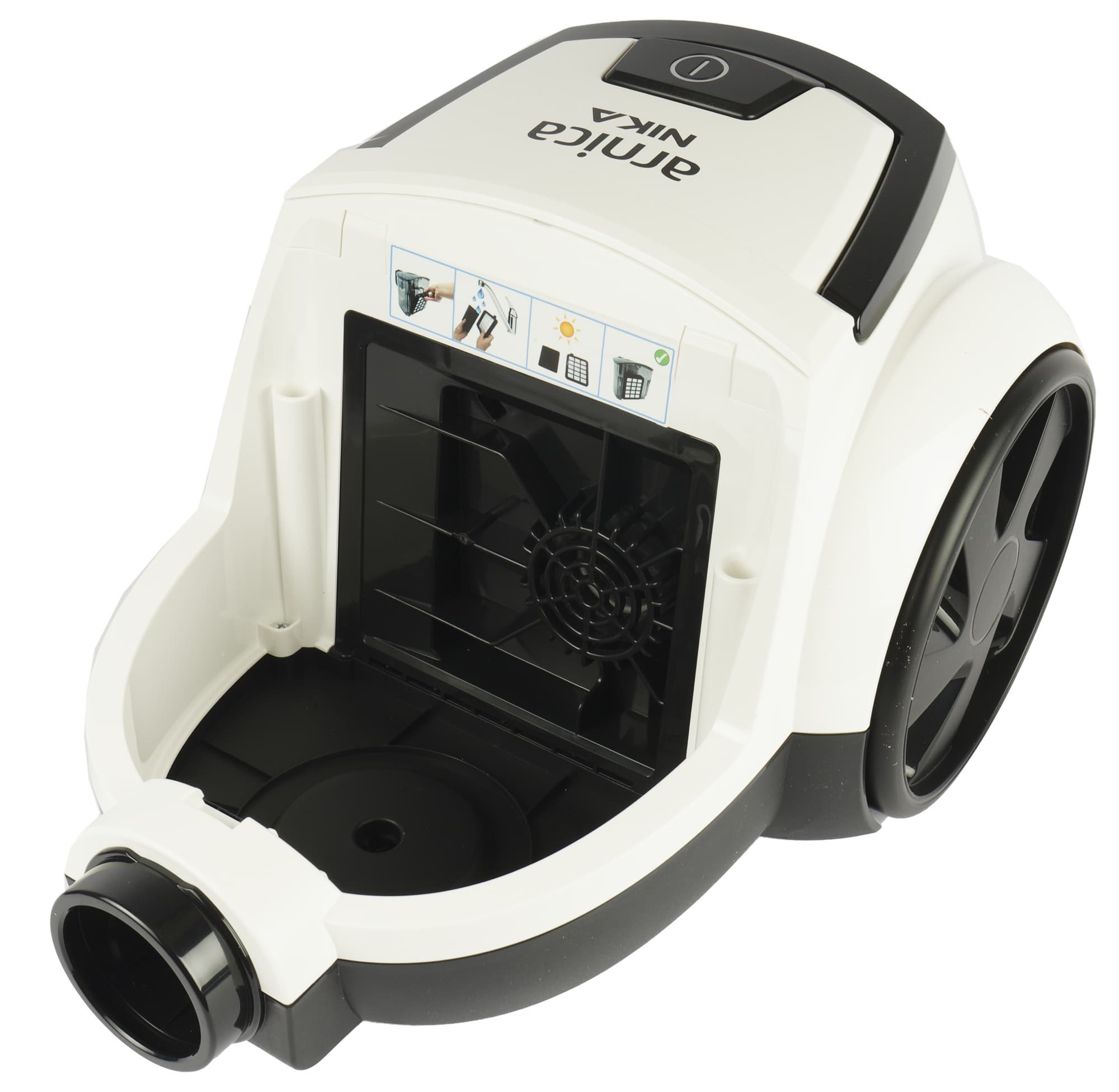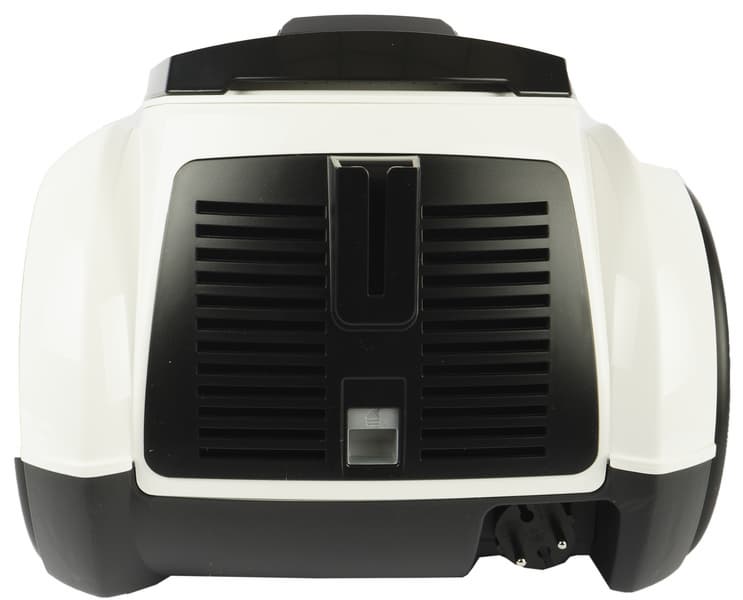 Всю переднюю половину корпуса занимает съемный мусоросборник из темного полупрозрачного пластика. Отсек контейнера с внутренней стороны украшен наклейкой, разъясняющей процесс опустошения емкости и ухода за ней.
