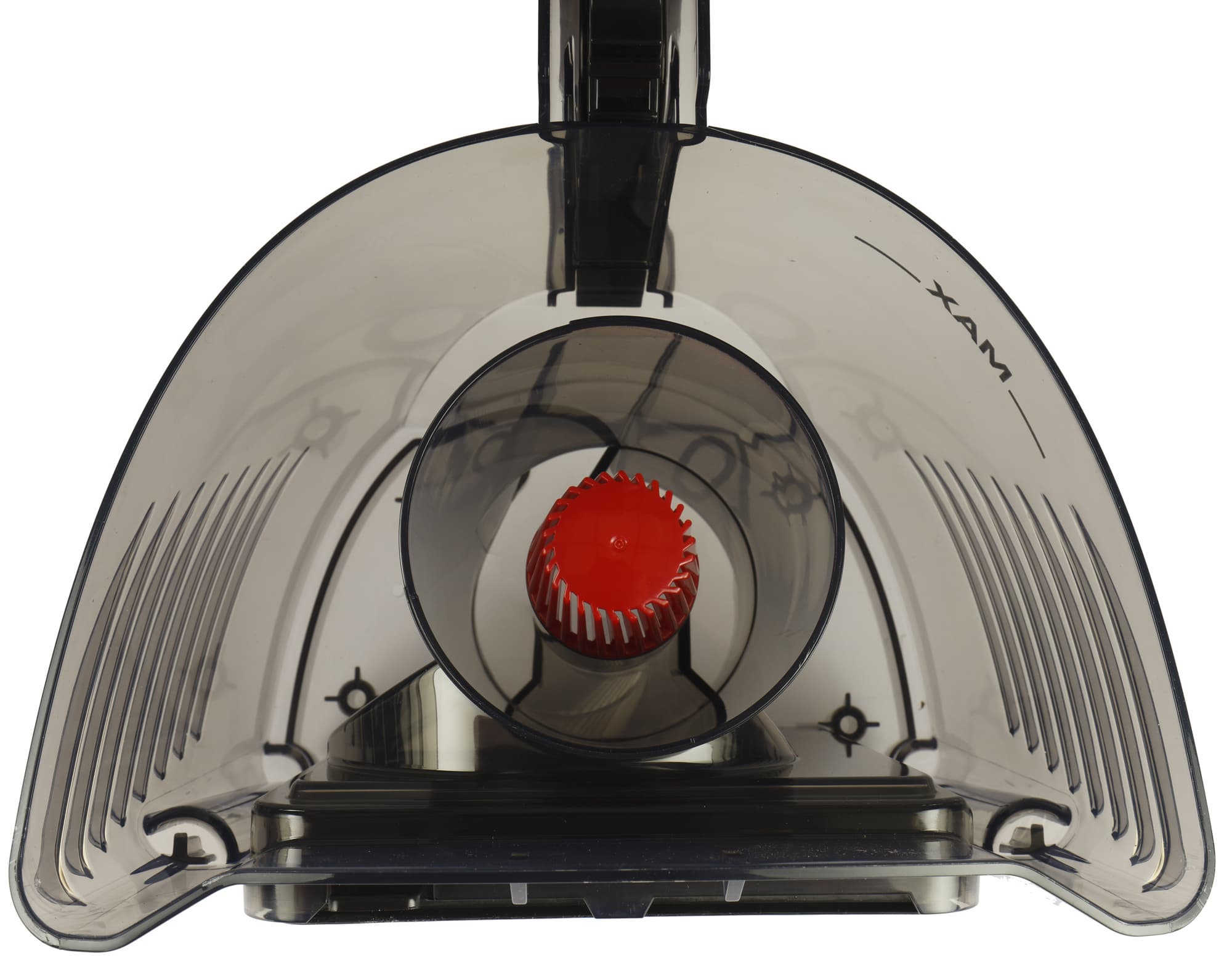 В центре емкости — циклонный элемент несложной конструкции. Благодаря центробежной силе мусор крупных фракций отбрасывается к краям контейнера через отверстие наверху шахты, а поток воздуха с пылью проходит через решетку конической формы и опускается вниз, в направлении фильтра тонкой очистки.