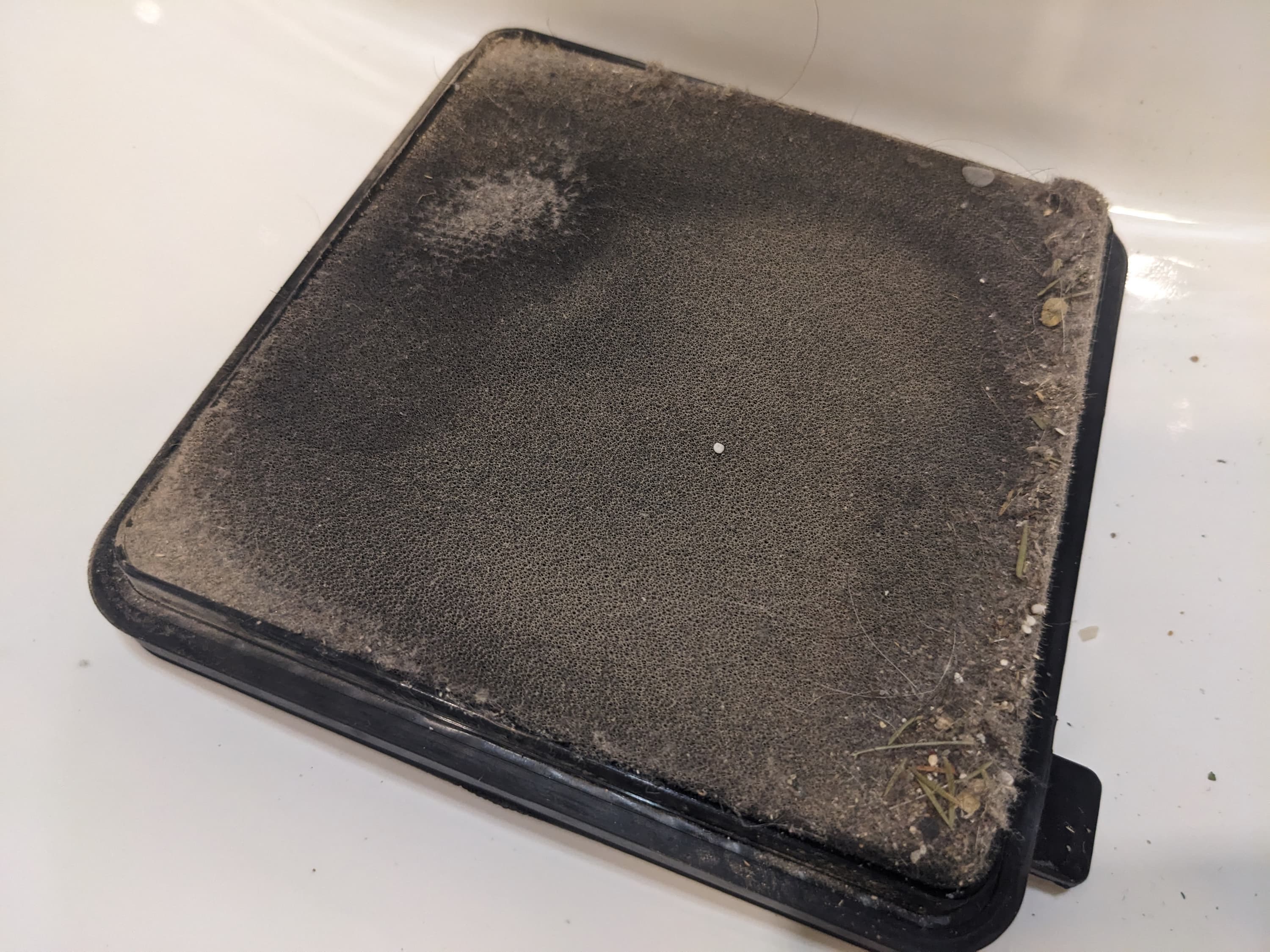 Квадратное выпускное отверстие контейнера закрыто моющимся фильтром тонкой очистки из нетканого материала, закрепленного на пластиковой решетке. Перед ним расположен квадратный поролоновый элемент.