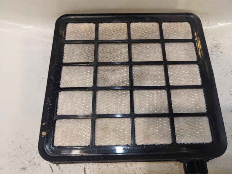 В «корме» пылесоса за выпускной решеткой расположен еще один фильтр. Он представляет собой ребристый HEPA-элемент в пластмассовой рамке.