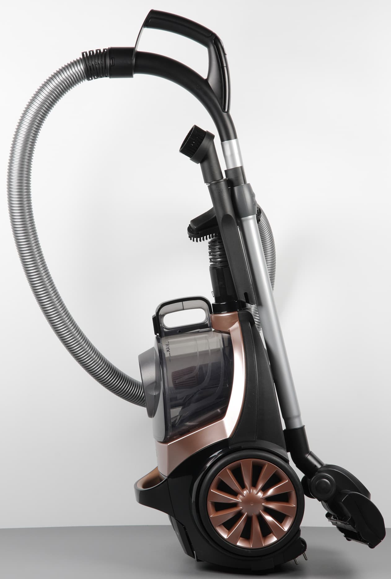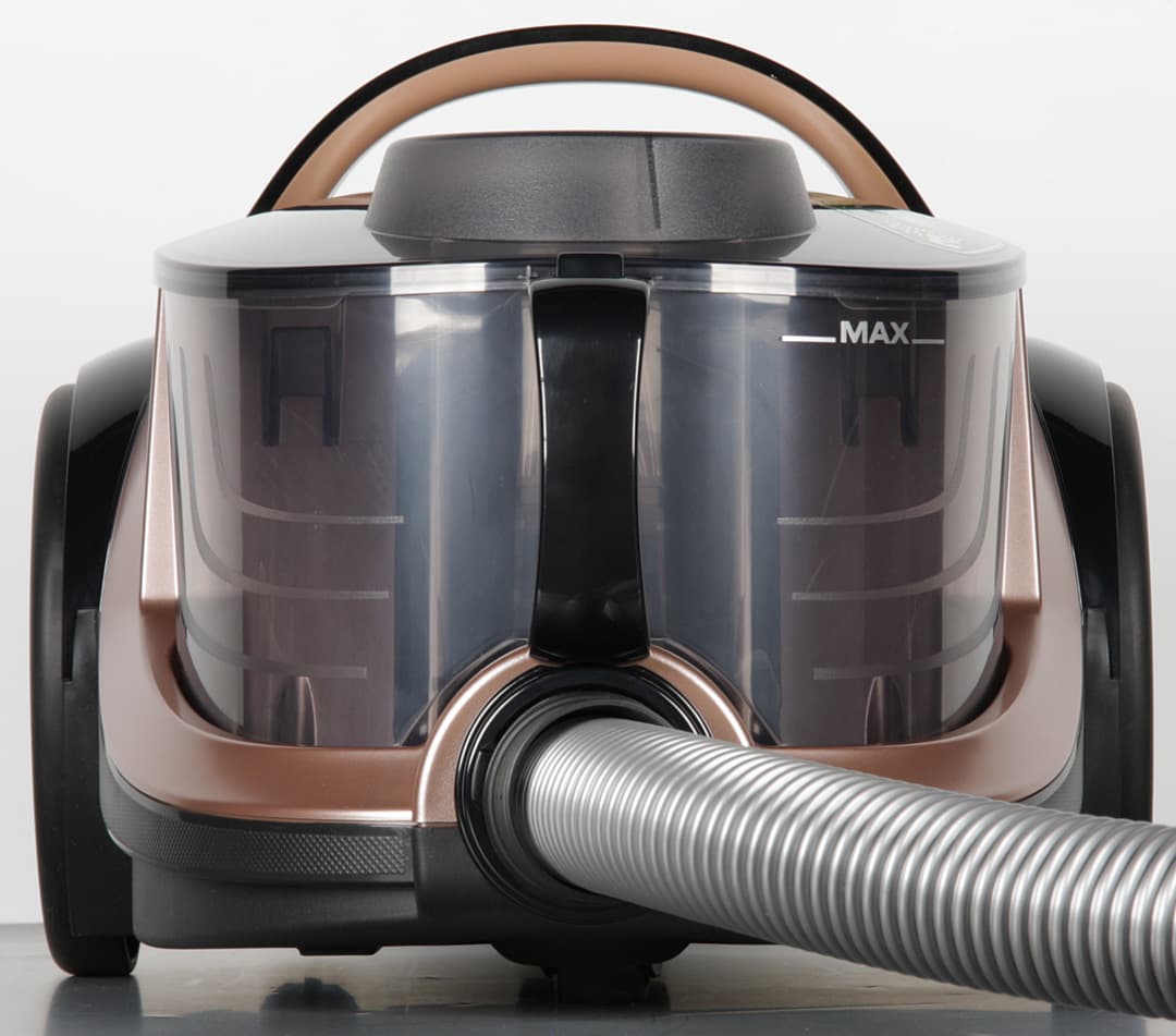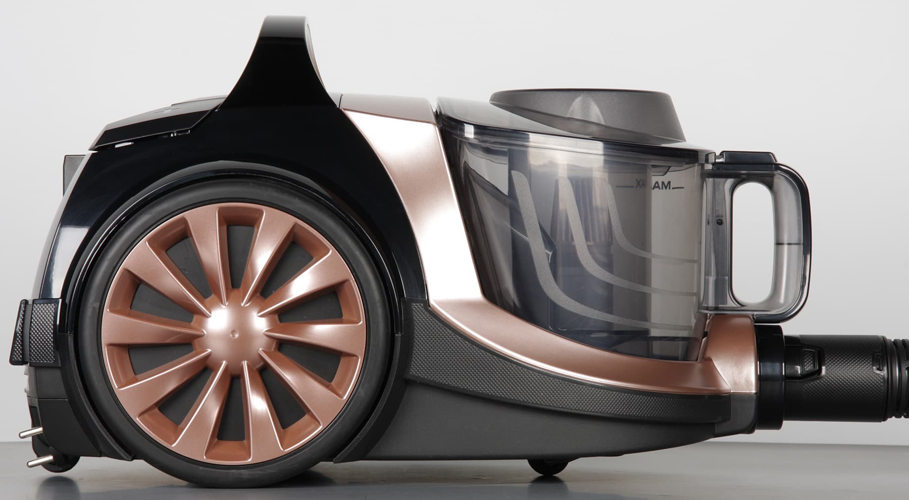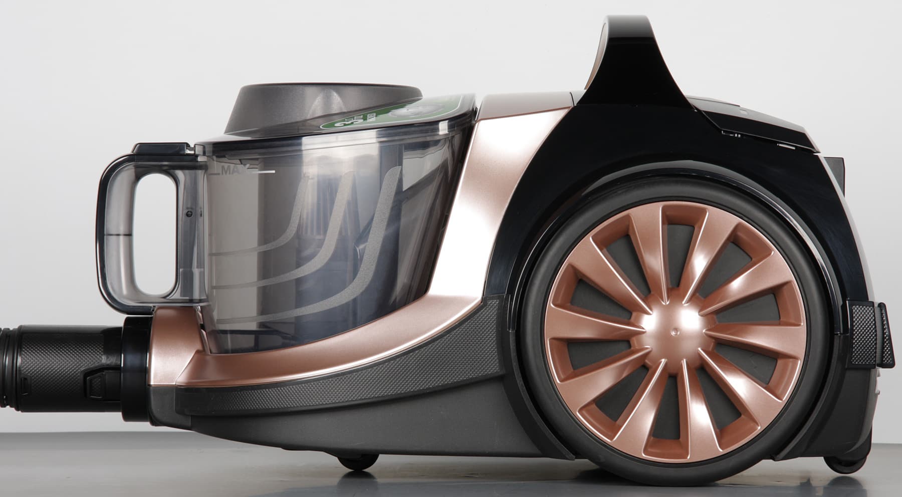 Дизайн практичный, но нескучный. Корпус пылесоса и аксессуары изготовлены в основном из пластика. Чаще всего применяется черный без покрытия пластик с матовой поверхностью, но в корпусе моторного блока есть детали с зеркально-гладкой поверхностью, а также элементы с красновато-серебристым покрытием — обода колес, отсек контейнера для мусора и кнопка питания.
