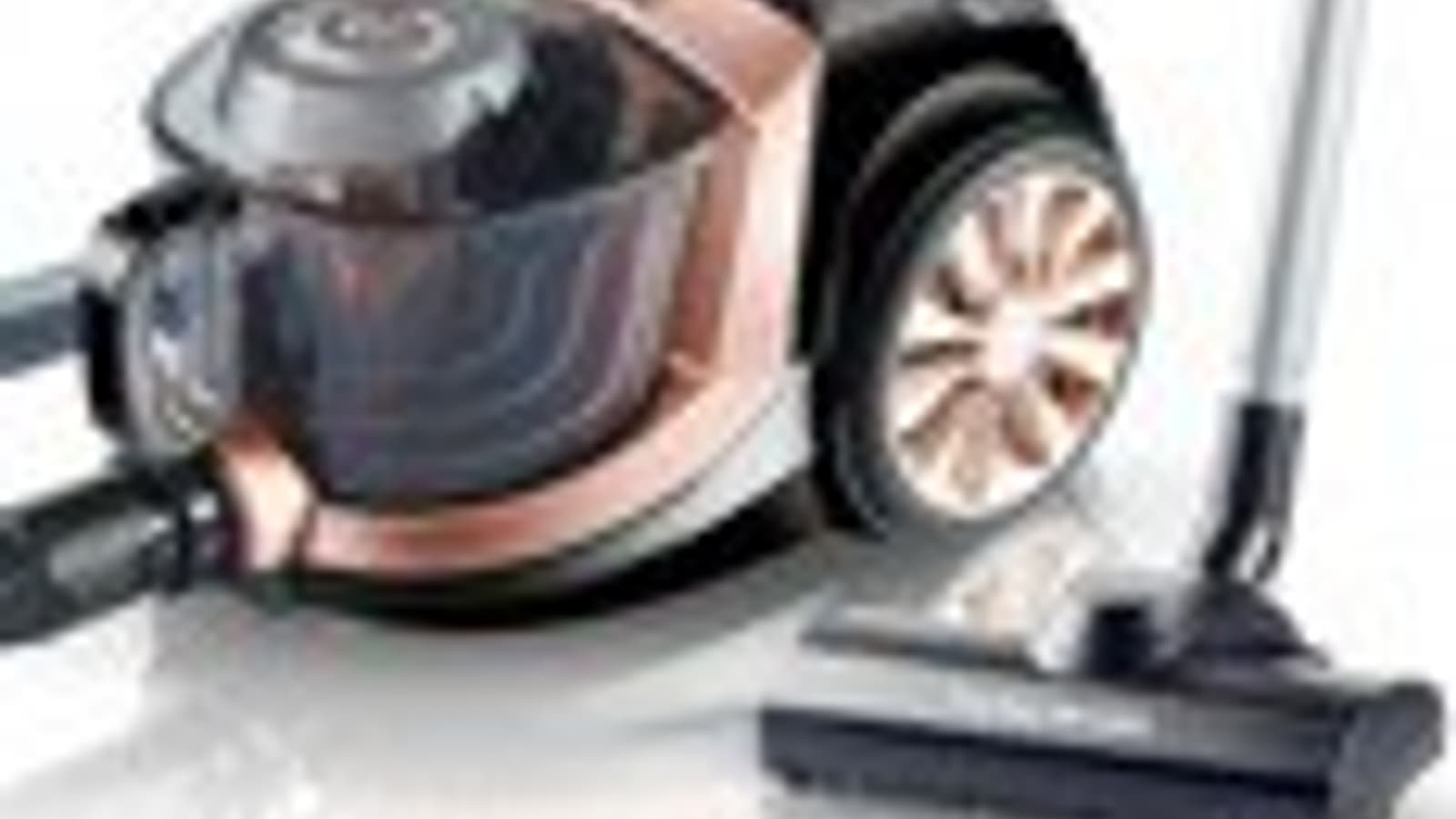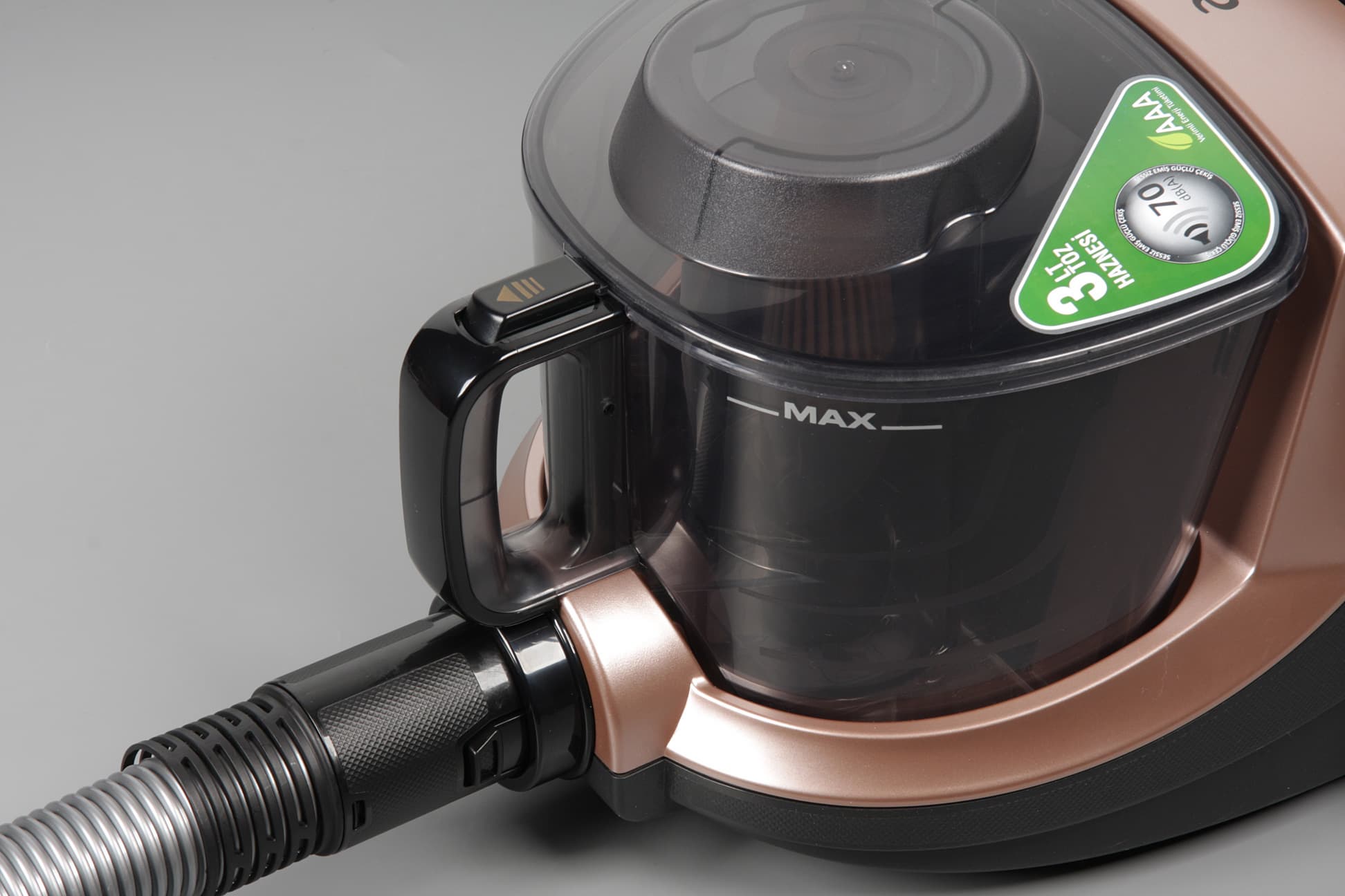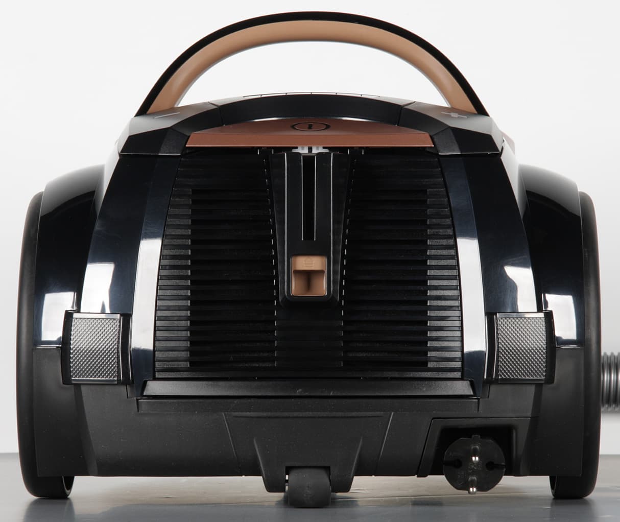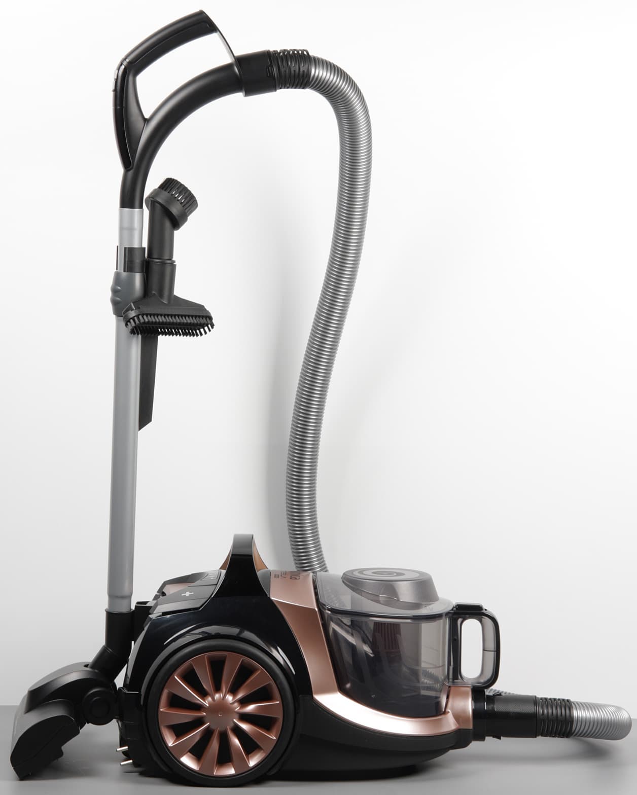 Дизайн практичный, но нескучный. Корпус пылесоса и аксессуары изготовлены в основном из пластика. Чаще всего применяется черный без покрытия пластик с матовой поверхностью, но в корпусе моторного блока есть детали с зеркально-гладкой поверхностью, а также элементы с красновато-серебристым покрытием — обода колес, отсек контейнера для мусора и кнопка питания.