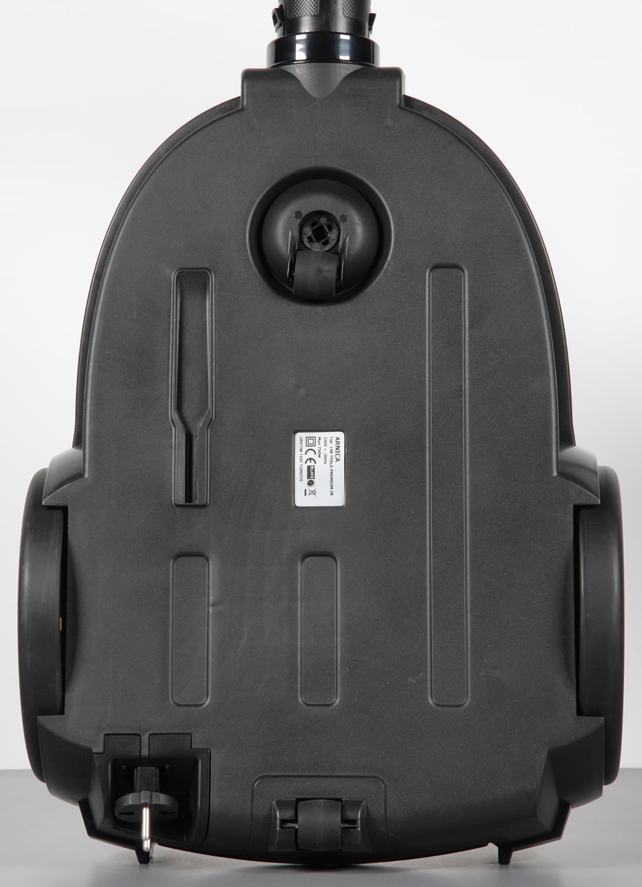 Ниже, почти у самого днища есть широкая педаль, которая снимает блокировку кабельной катушки. Снять блокировку можно также потянув за кабель и плавно отпустив его. Согласно нашим замерам длина кабеля составляет 7,8 м, а диаметр его оболочки 6,2 мм. На днище в передней части есть небольшой подруливающий ролик на поворотной выпуклой площадке. В задней части есть еще один ролик, ось которого зафиксирована. На фотографиях хорошо видно, что, несмотря на большие колеса диаметром 191 мм, «дорожный» просвет очень маленький. Впрочем, в данном случае это не принципиально, так как пылесос тащит сам пользователь, при этом относительно скользкий пластик, скосы и закругления в нужных местах облегчают преодоление высоких порогов и прочих напольных препятствий.