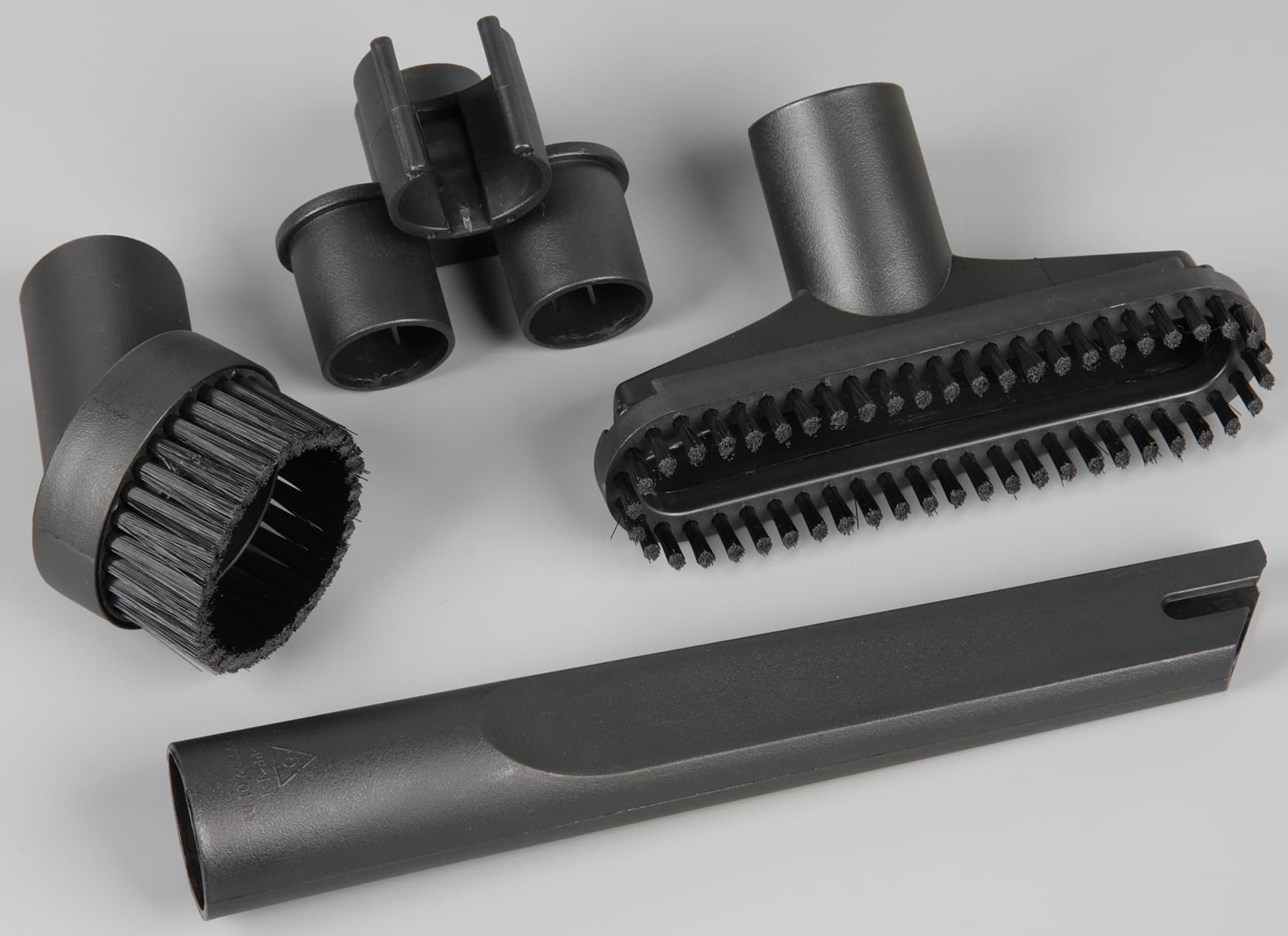 К пылесосу прилагается типичная щелевая насадка (длиной 235 мм), круглая щетка диаметром 62 мм и с щетиной средней жесткости длиной 25 мм и насадка 2-в-1 шириной 150 мм со съемным венцом из жесткой щетины длиной 12 мм.