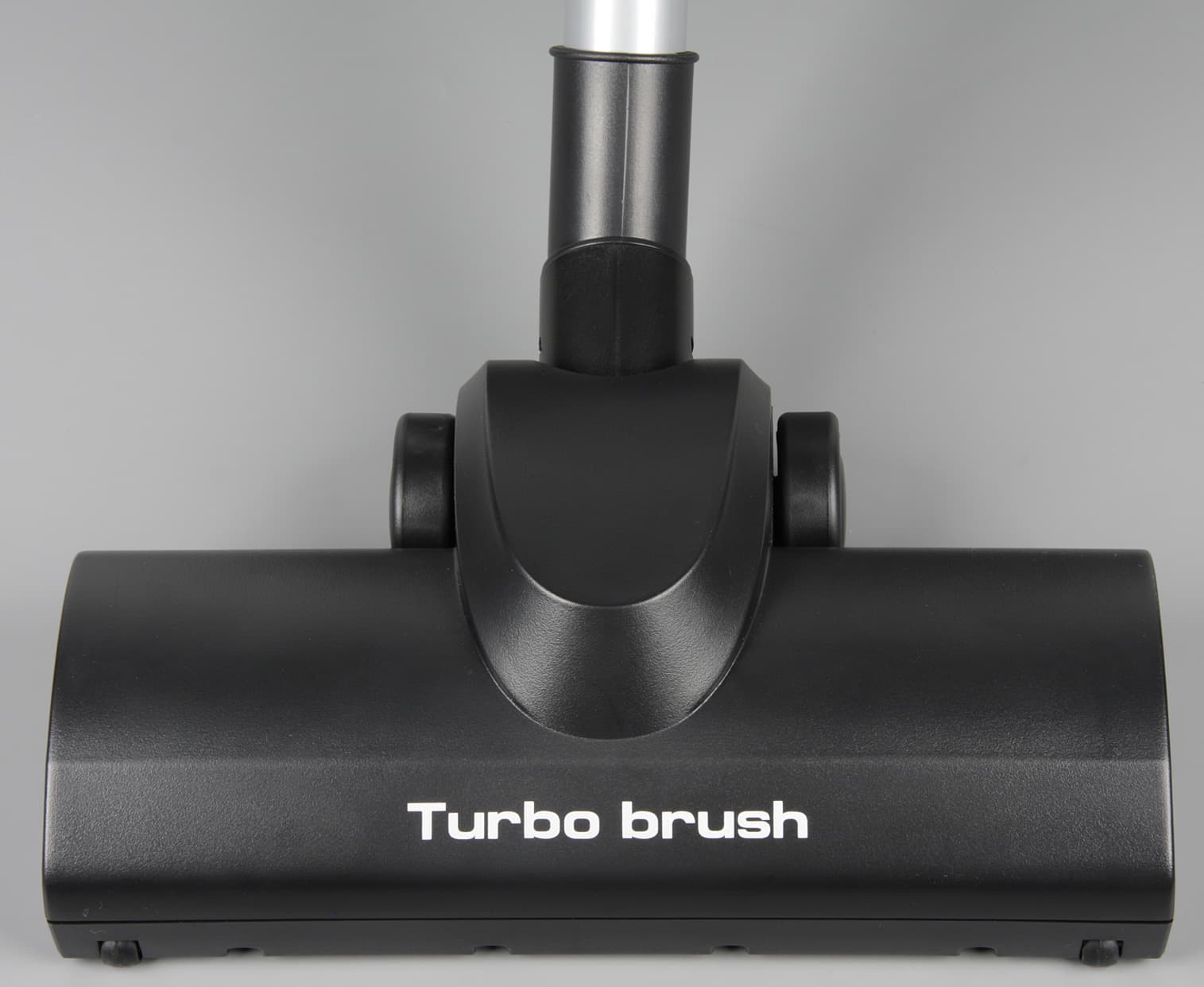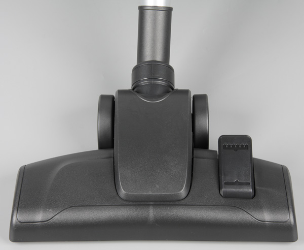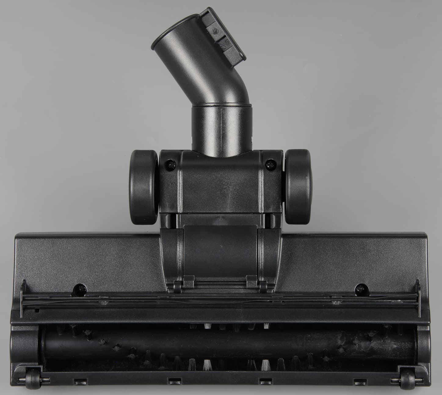 Во вращение щетка приводится при помощи небольшой турбинки, которую закручивает всасываемый воздух. Для вращения турбинки используется проходящий через щетку воздух, обособленного забора именно для турбинки нет, поэтому мусор может помешать работе привода. Инспекция состояния турбинки проводится через специальный лючок, расположенный снизу на корпусе щетки. Без разбора корпуса насадки вытащить щетку не получится. Вал щетки относительно большого диаметра, а именно 20 мм. Отметим наличие упругого скребка снизу почти во всю ширину щетки. Есть боковые каналы для засасывания мусора с торцов и перепускные отверстия спереди, помогающие сохранять достаточный для вращения щетки поток воздуха даже на гладких и ровных поверхностях. Скользить щетке по полу помогают два колесика под шарниром и два небольших ролика спереди. Насадка оснащена шарниром обеспечивающим отклонение по вертикали примерно на 45 градусов, и патрубком, вращающимся в месте стыка с корпусом щетки на угол чуть более 180 градусов. Эту щетку можно подсовывать под протяженные предметы обстановки с просветом где-то 83 мм. Ширина насадки равна 269 мм.