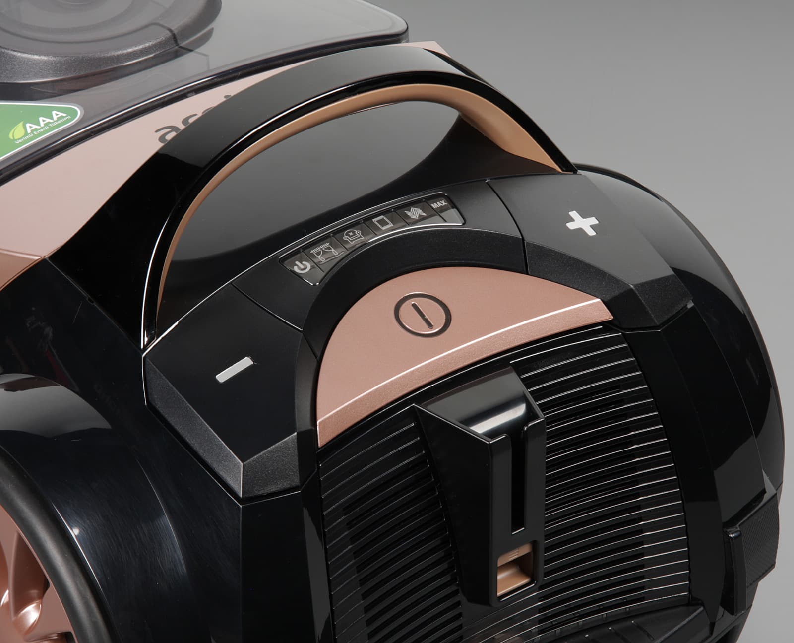 По бокам сверху в задней части есть две педали: левая — снижает мощность, правая — повышает. Текущий уровень мощности показывает шкала из пиктограмм, подсвечиваемых белыми светодиодами. Мигание красным крайнего левого значка указывает на режим ожидания. Включается-выключается пылесос большой кнопкой-педалью по центру.