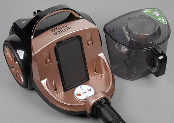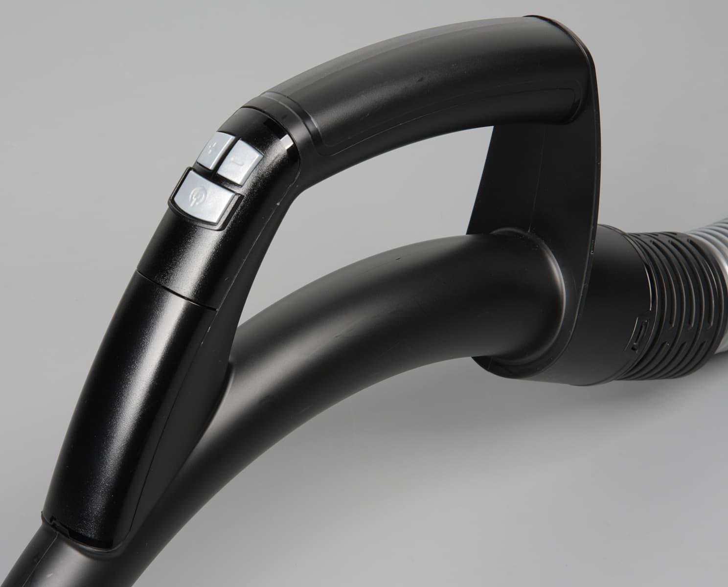 Кнопка питания на рукоятке выключает мотор пылесоса и переводит его в режим ожидания. Педаль на корпусе отключает пылесос совсем, при этом кнопки на рукоятке уже не работают. Последующее включение педалью включает пылесос на максимальную мощность. Однако, если пылесос был выключен с рукоятки, то он остается выключенным при переподключении к сети, а с рукоятки он включается на ту же мощность, которая была выбрана до выключения. Вместо традиционного проводного управления используется передача сигналов по ИК-каналу с автономным питанием передатчика. Соответственно, в рукоятке есть батарейный отсек, куда вставляются два элемента питания типа ААА. ИК-приемник расположен сверху на ручке-скобе за вставкой из тонированного пластика.Управление по ИК надежнее и долговечнее проводного, так как при использовании проводов в шлангах они подвержены интенсивному механическому воздействию, вследствие чего часто переламываются, и управление с рукоятки перестает работать. Телескопическая труба оснащена механизмом с автоматической фиксацией, поэтому для изменения ее длины достаточно ухватиться одной рукой за пластиковую муфту, а второй потянуть за ручку.