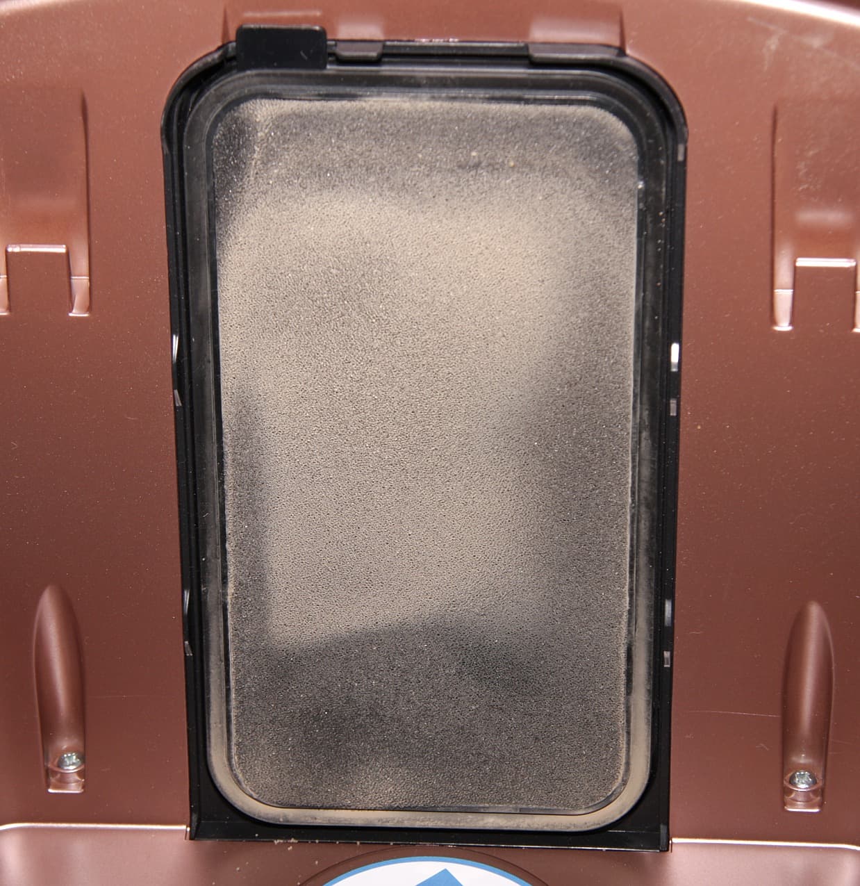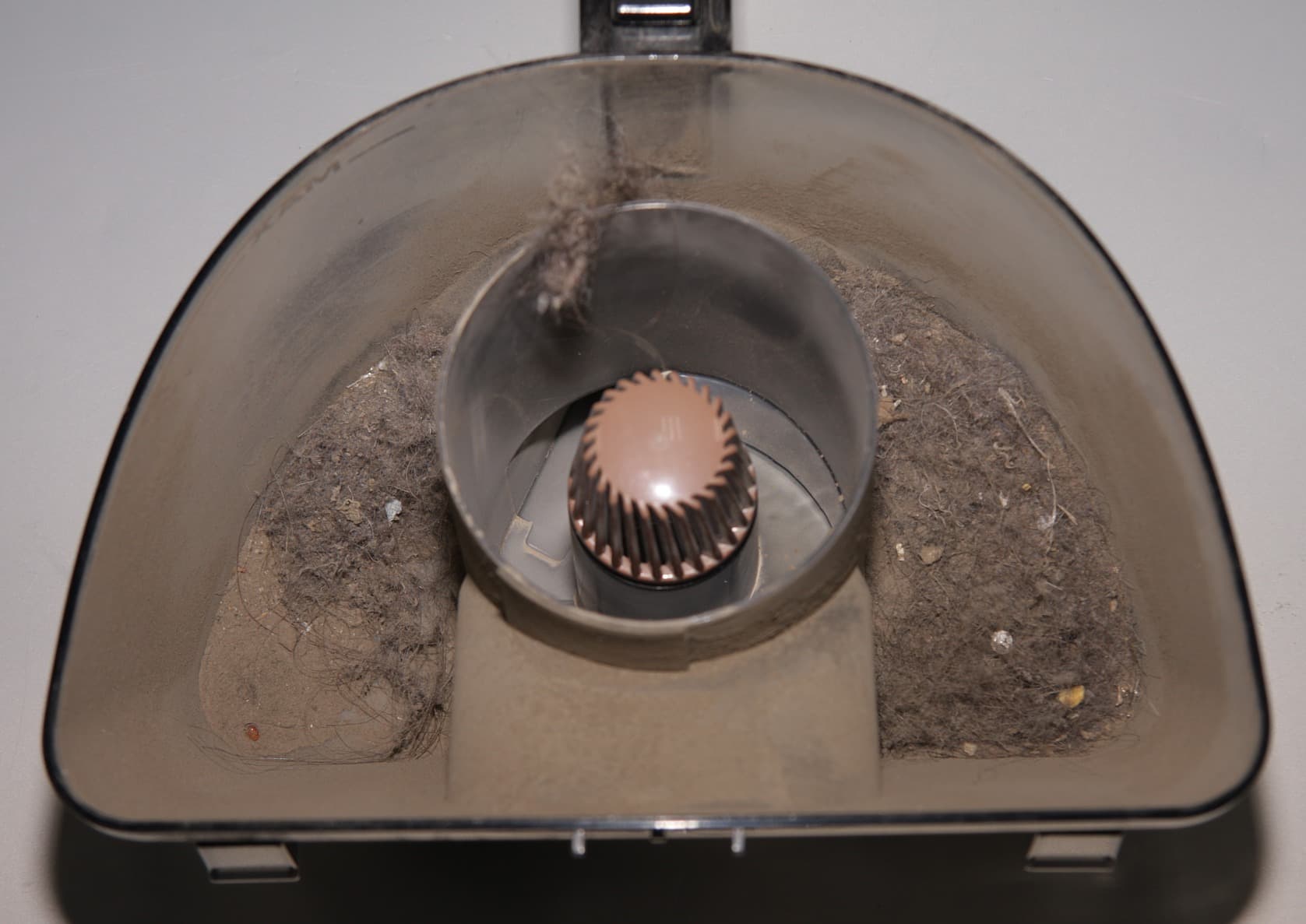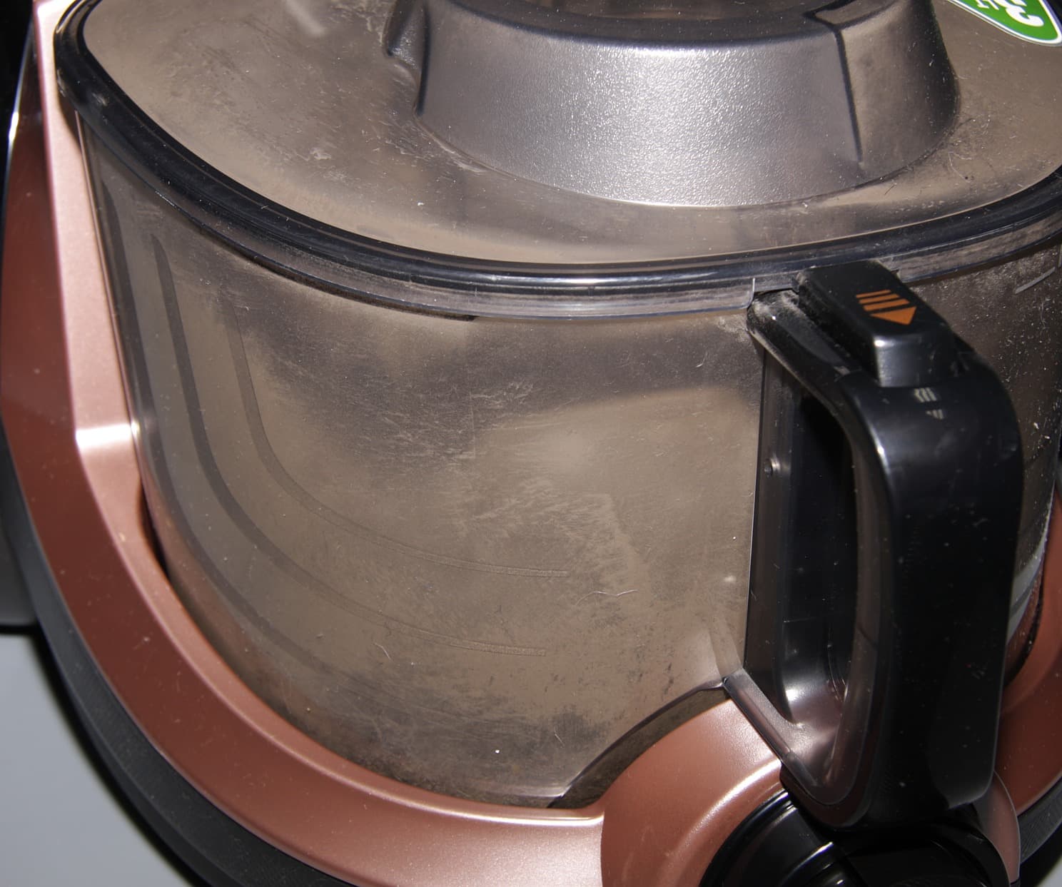 Внутренняя поверхность циклонной камеры из-за абразивного воздействия твердых частиц быстро и необратимо мутнеет. Пылесборник легко достается, а его крышка полностью снимается. Для этого сначала нужно нажать на кнопку фиксатора, затем просто потянуть крышку вверх. Так его проще опорожнять и мыть. Практически весь мусор оказался во внешнем отсеке, только вверху циклонной камеры свалялся пучок из волос.