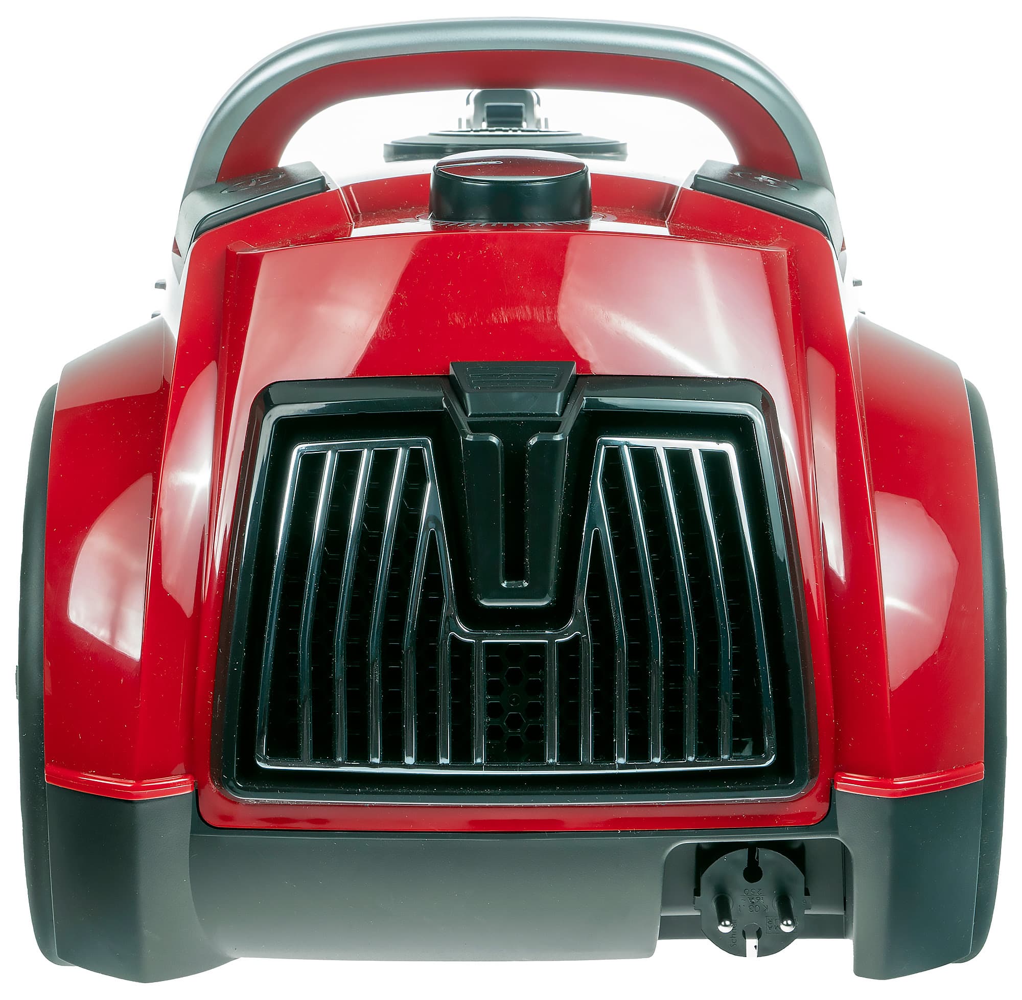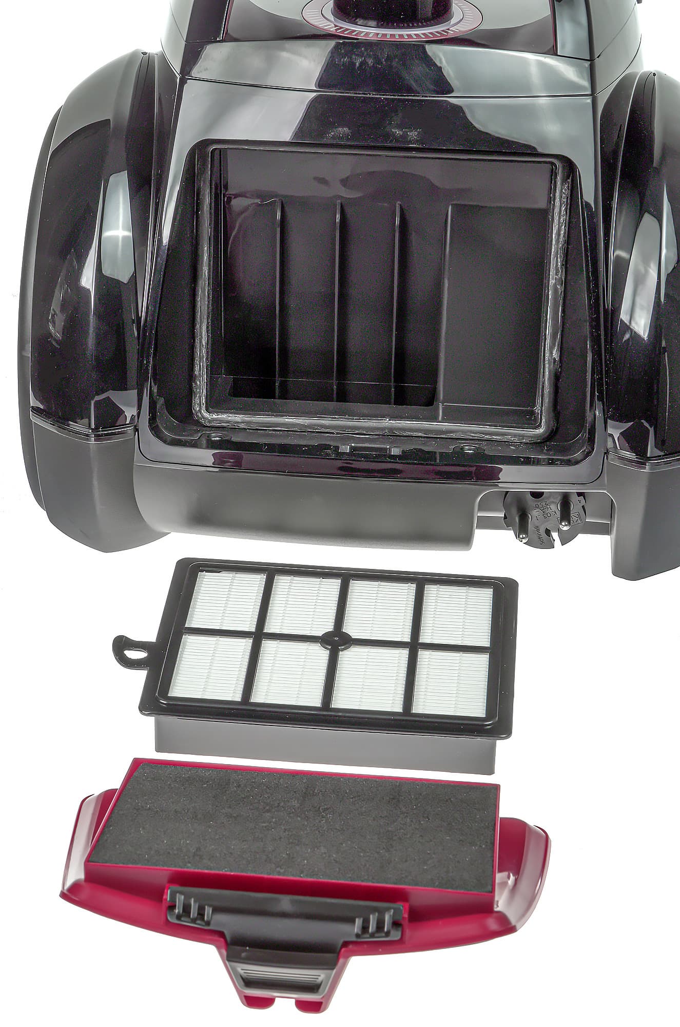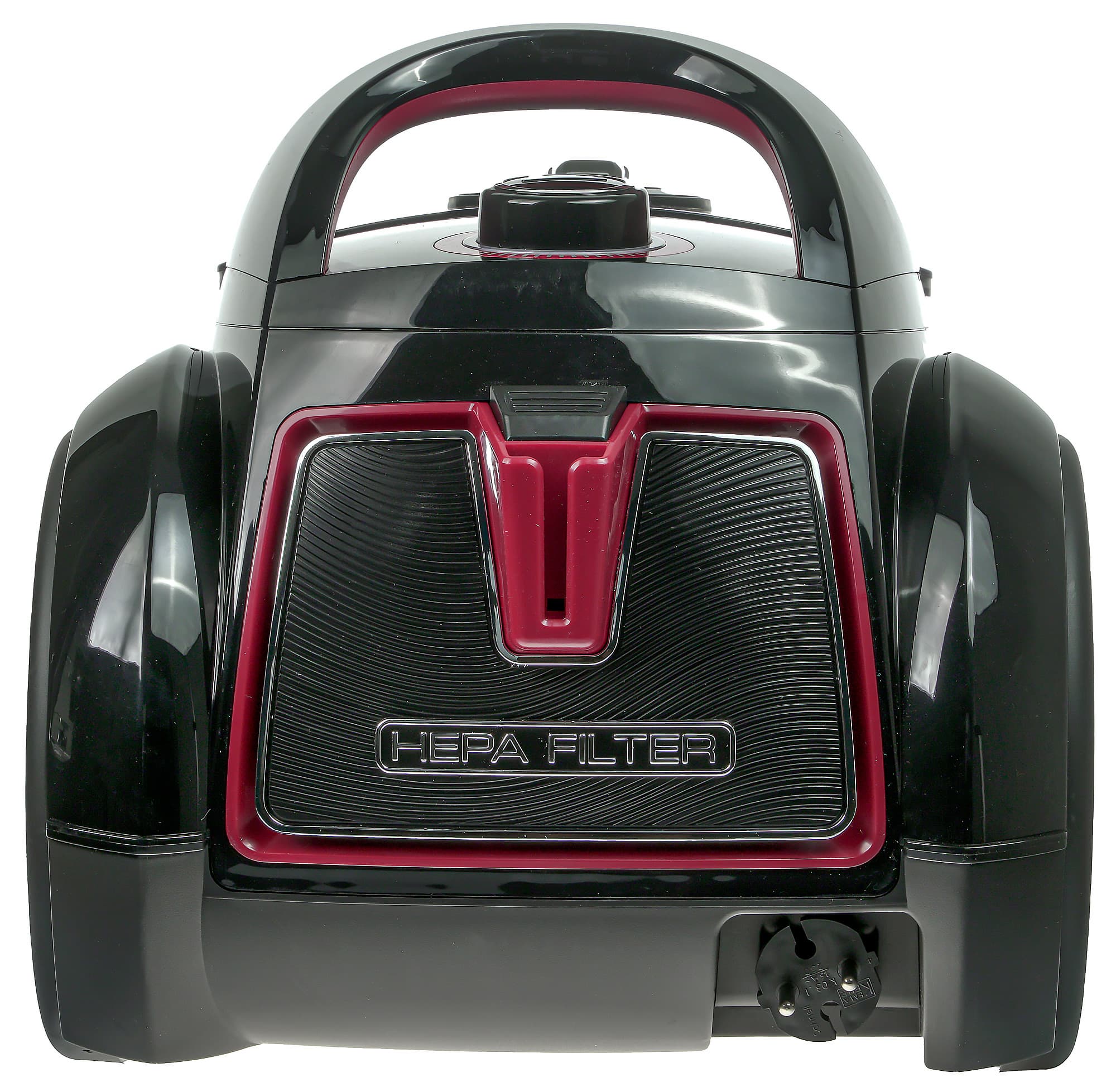 Выпускной фильтр размещается за декоративной решеткой в задней части корпуса. Здесь же находится ниша для шнура питания. Еще один паз для фиксации напольной насадки — в центре решетки.