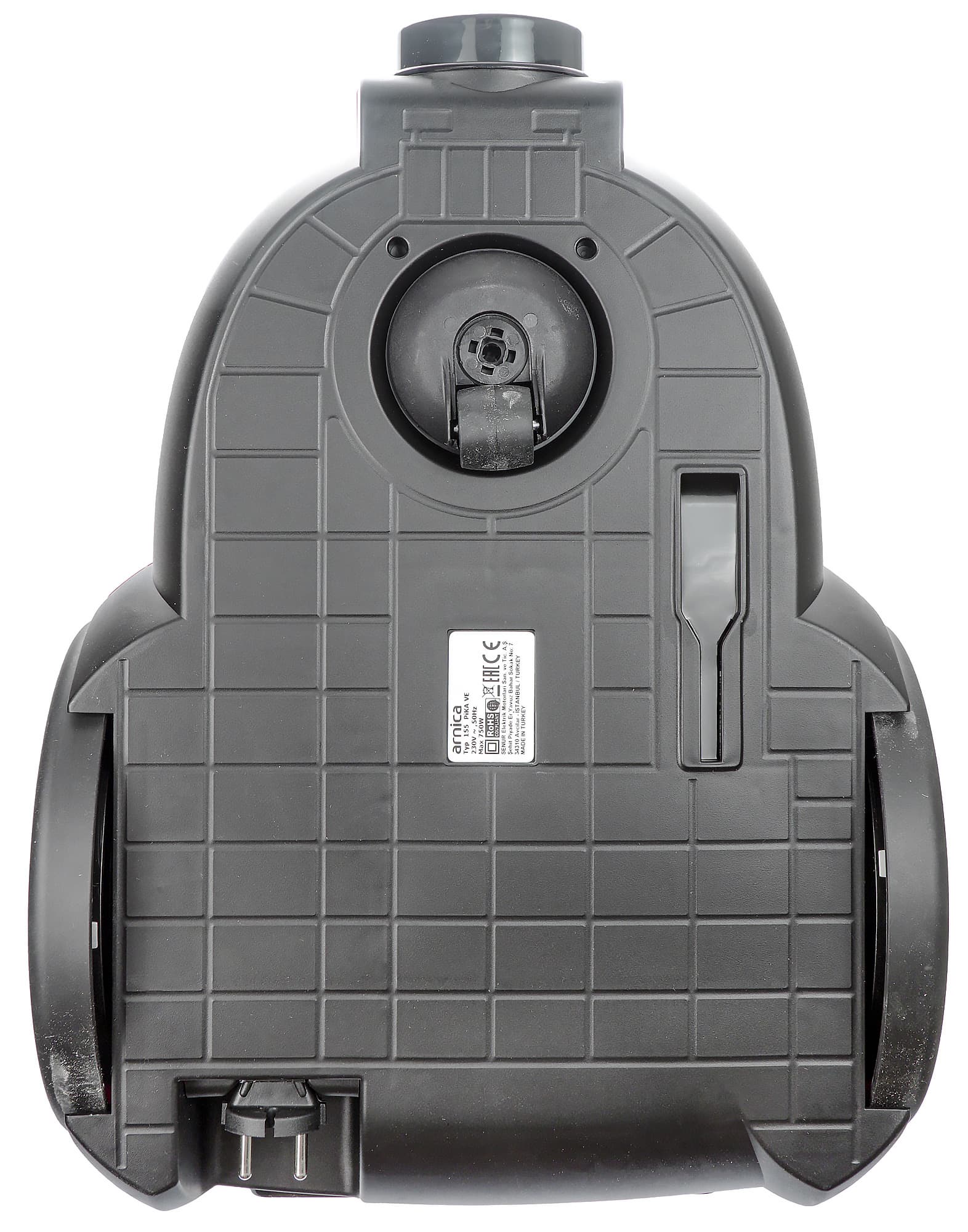 Ничем не отличается и дно этой модели — те же опорное колесо, шильдик и паз для напольной насадки.