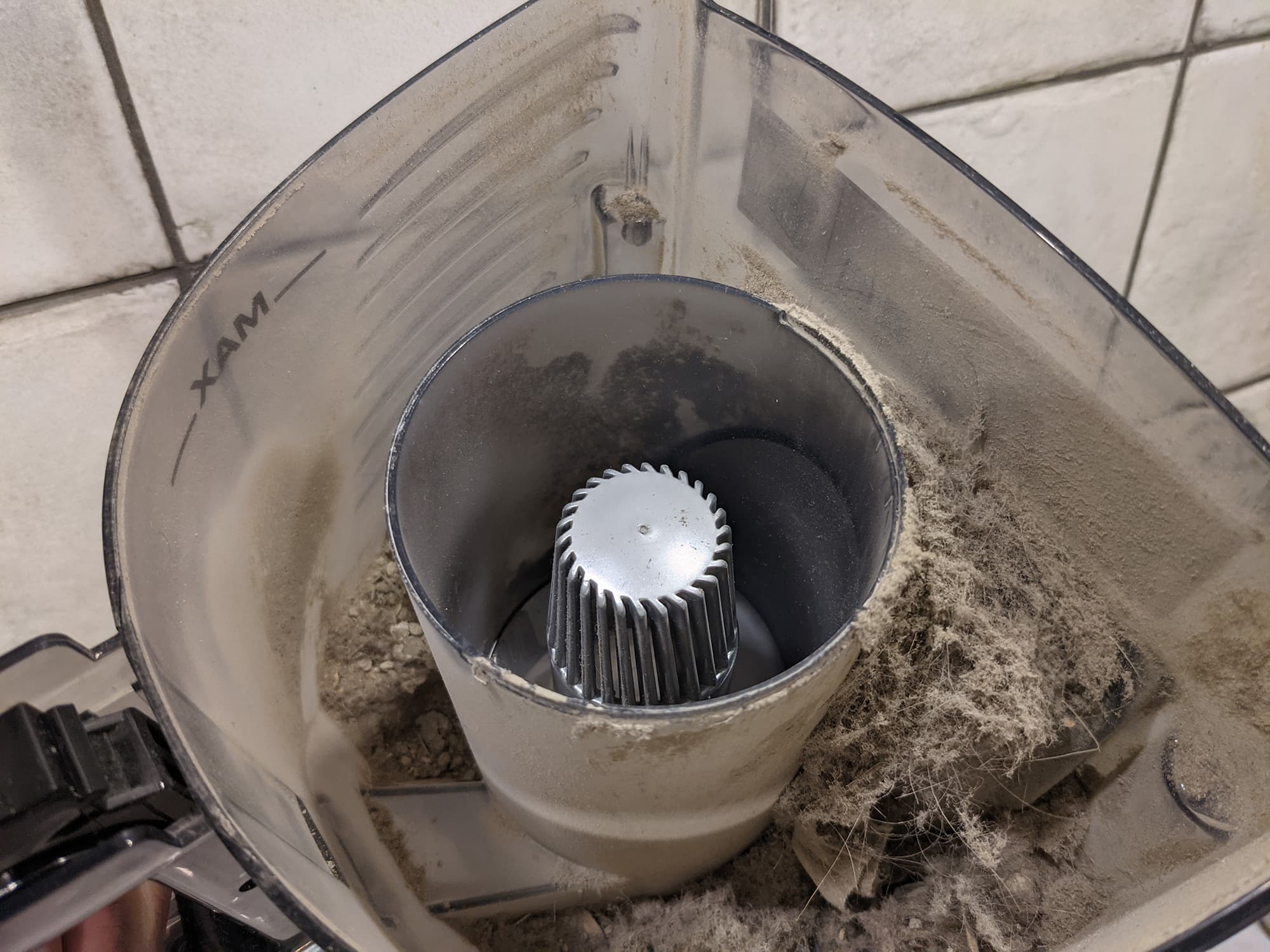 Первая ступень очистки — циклонный фильтр — выполняет свои функции на 100%. Весь мусор остается в отсеке циклона, а центральная труба, через которую поток воздуха поступает на фильтр тонкой очистки, остается почти идеально чистой: в ней нет ни шерстинки.