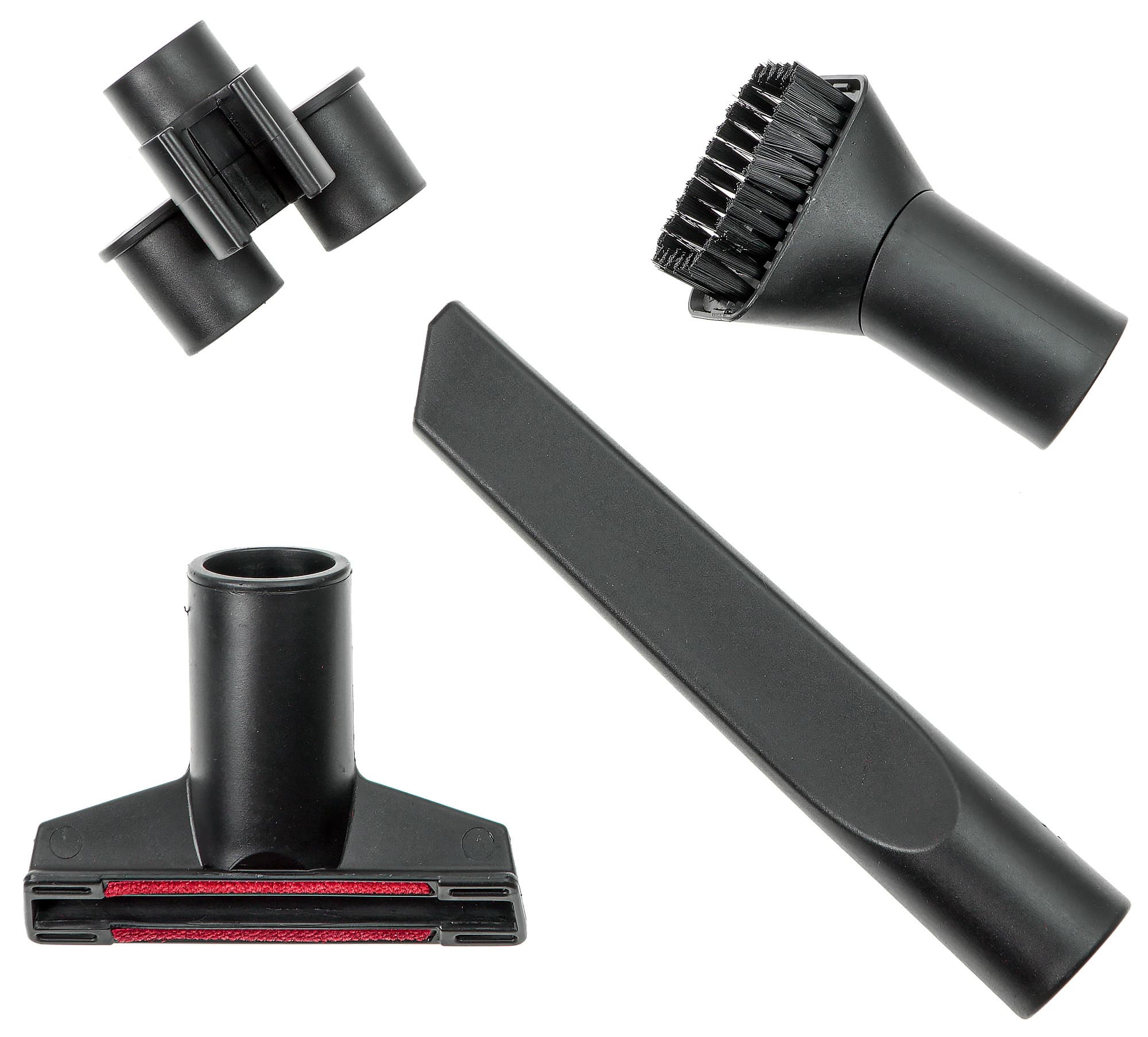 Комплект насадок для ручной уборки включает в себя круглую насадку-щетку для мебели, широкую насадку для чистки текстиля и щелевое сопло.
