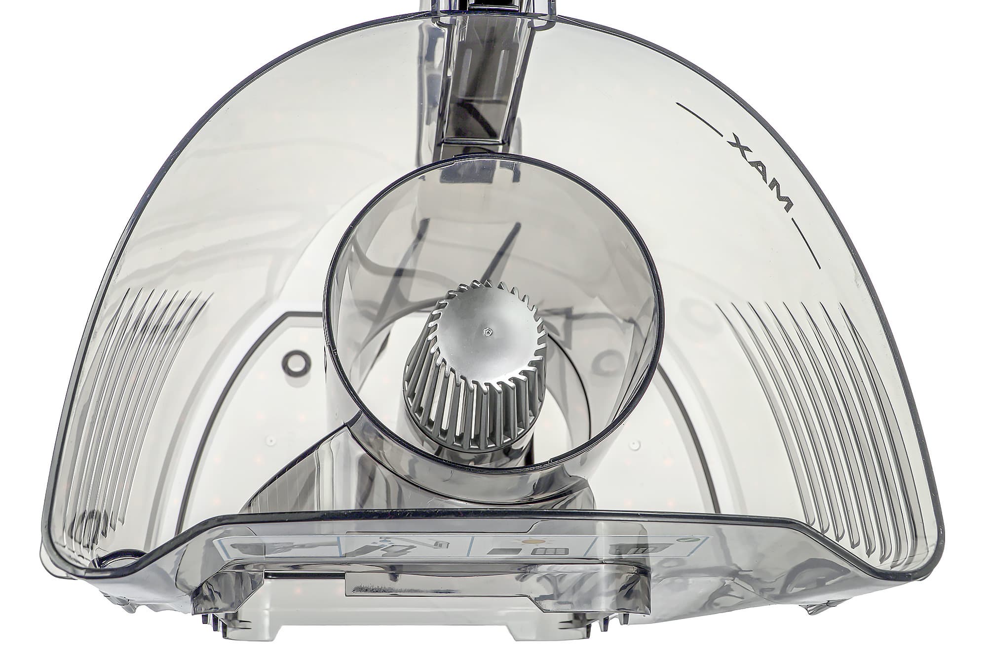 Поток воздуха с пылью и мусором попадает в контейнер через отверстие под ручкой, закручивается против часовой стрелки благодаря аэродинамическим элементам и поднимается вверх через центральную трубку.