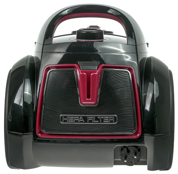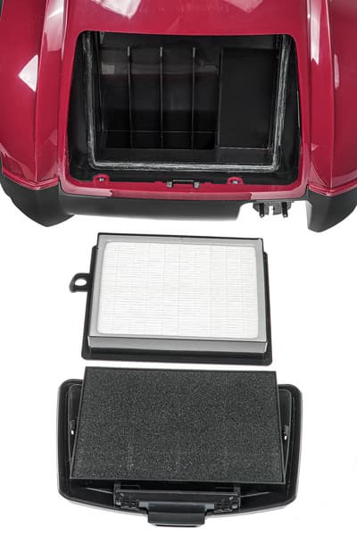 Покидающий моторный блок поток воздуха проходит вначале через выпускной HEPA-фильтр прямоугольной формы, а затем — через довольно толстый поролоновый. Эффективность такой конструкции вызвала у нас вопросы, с которыми мы обратились к производителю. Ответ был следующим: основная задача дополнительного поролонового фильтра — сделать пылесос тише.