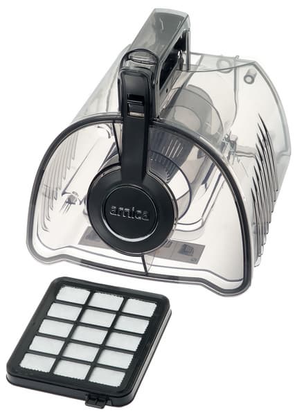 Производитель считает важным указать, что пылесос снабжен трехфункциональным предохранительным блокиратором, эргономичной ручкой, моющимся HEPA-фильтром 13 класса, имеет электронную регулировку мощности всасывания и мусоросборник емкостью 2,5 литра. Смысл надписи «использование практической емкости» в сочетании с фотографией мусоросборника от нас, признаться, ускользнул.