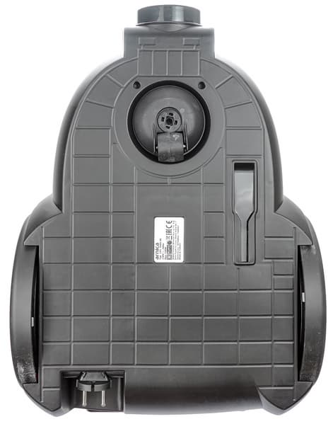 Решение корпуса допускает вертикальное размещение при хранении. На почти гладком дне, помимо опорного колеса и шильдика с серийным номером, есть паз для напольной насадки.