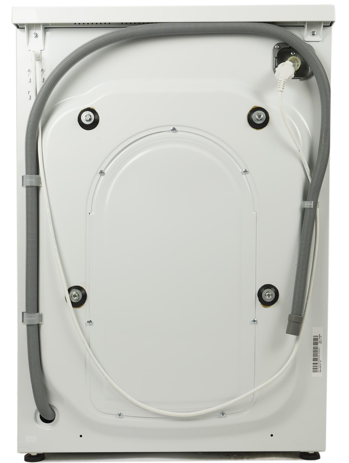 Из левого нижнего угла выходит несъемный гофрированный сливной шланг традиционной конструкции и привычного вида. Здесь же можно найти транспортировочные болты, удерживающие барабан в «походном положении». Перед началом эксплуатации их следует удалить вместе с резиновыми демпферами и пластиковыми шайбами.