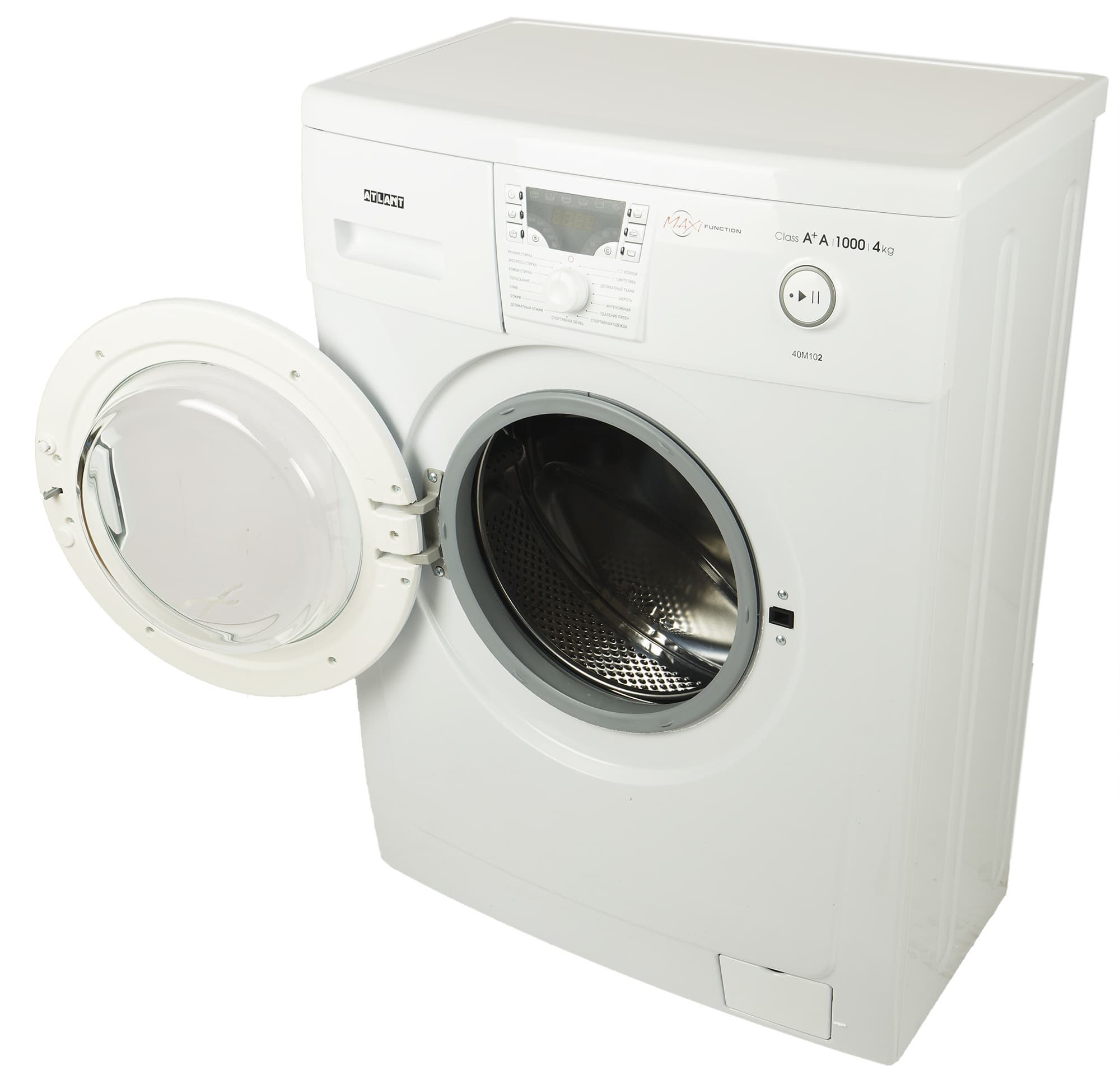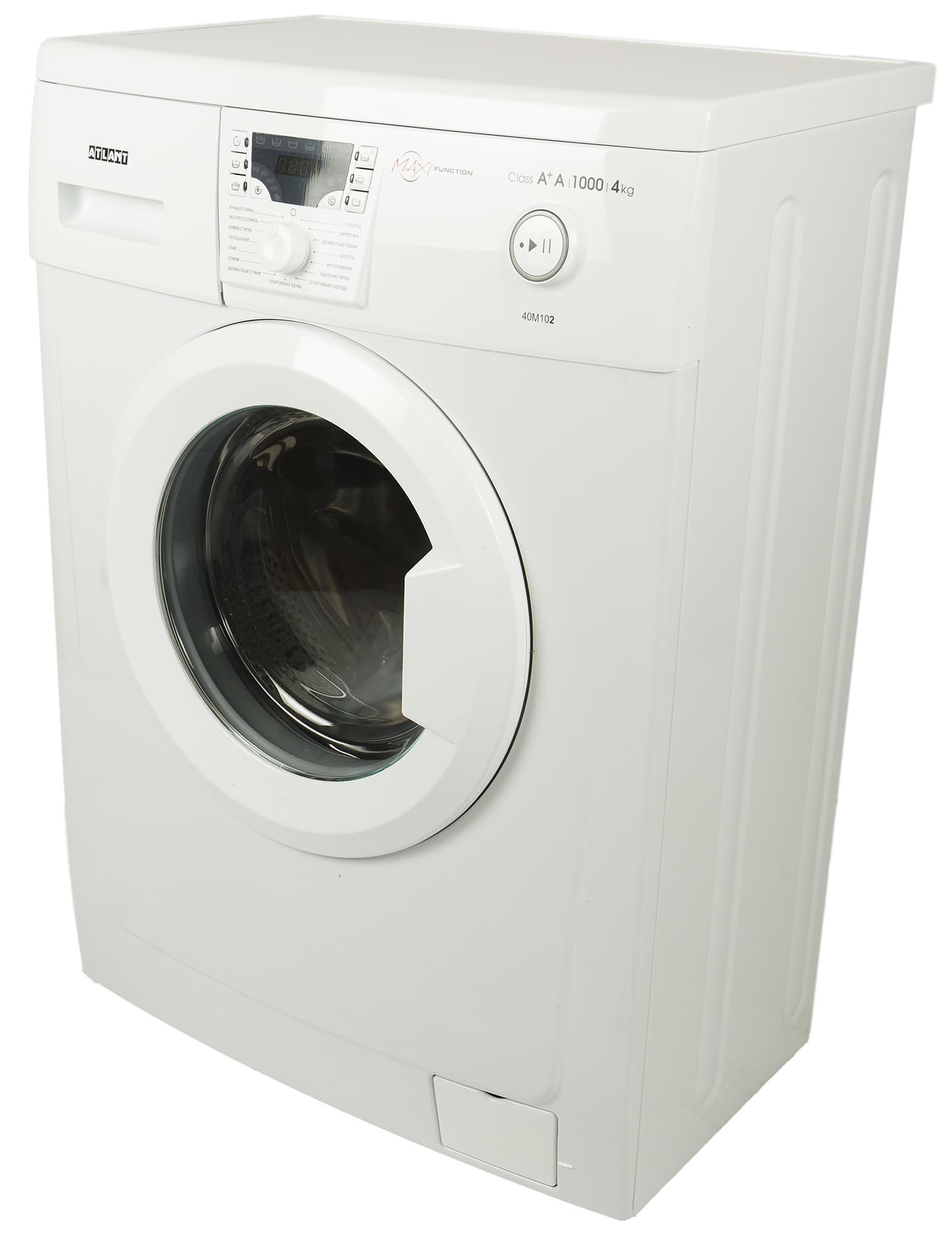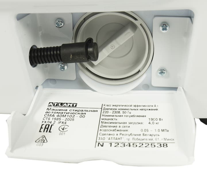 Атлант CMA 40M102-00 относится к классу сверхкомпактных стиральных машин: глубина ее корпуса составляет всего 328 мм. С учетом выступающих деталей (панели управления, ручек и элементов крышки барабана) максимальный габарит оказывается чуть больше: 38,7 см.