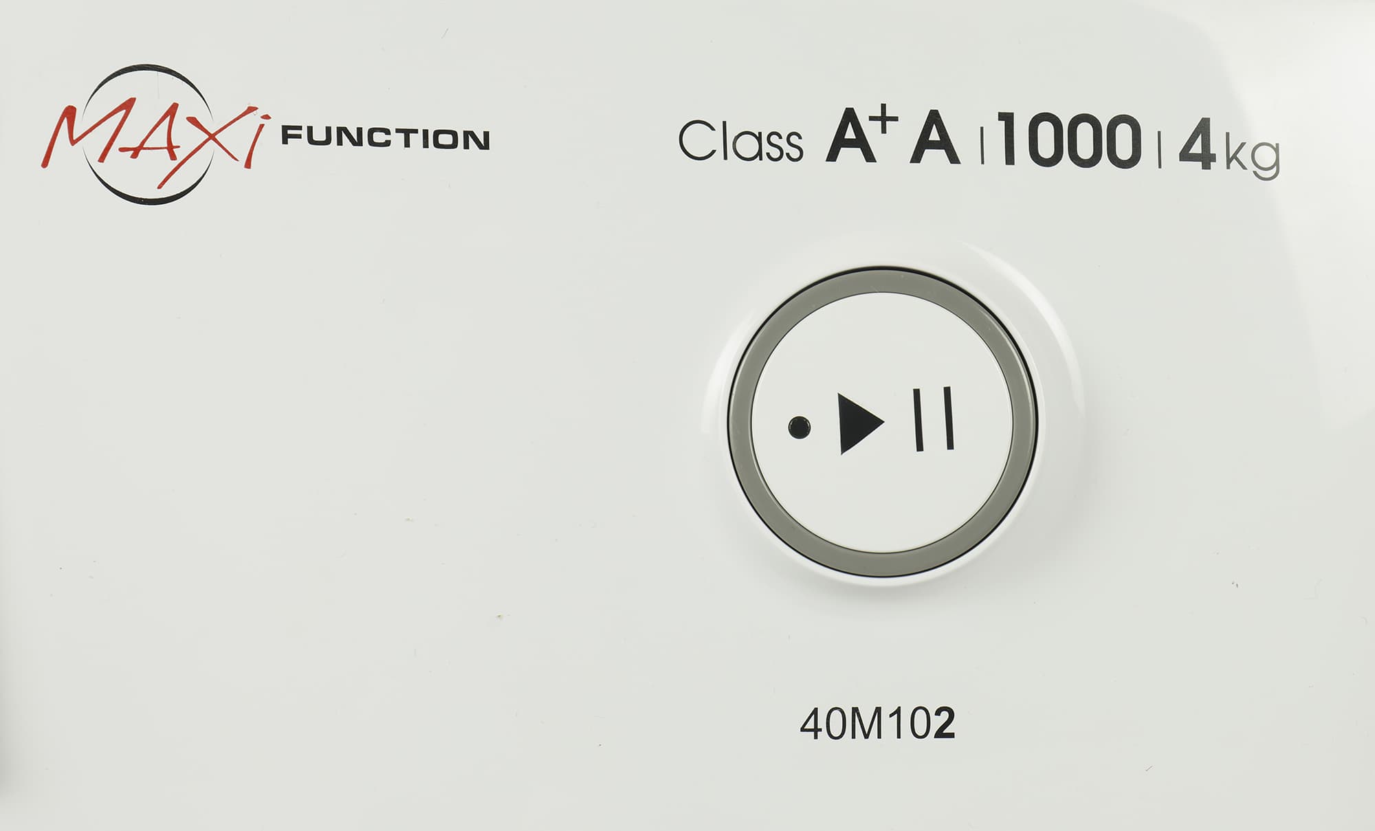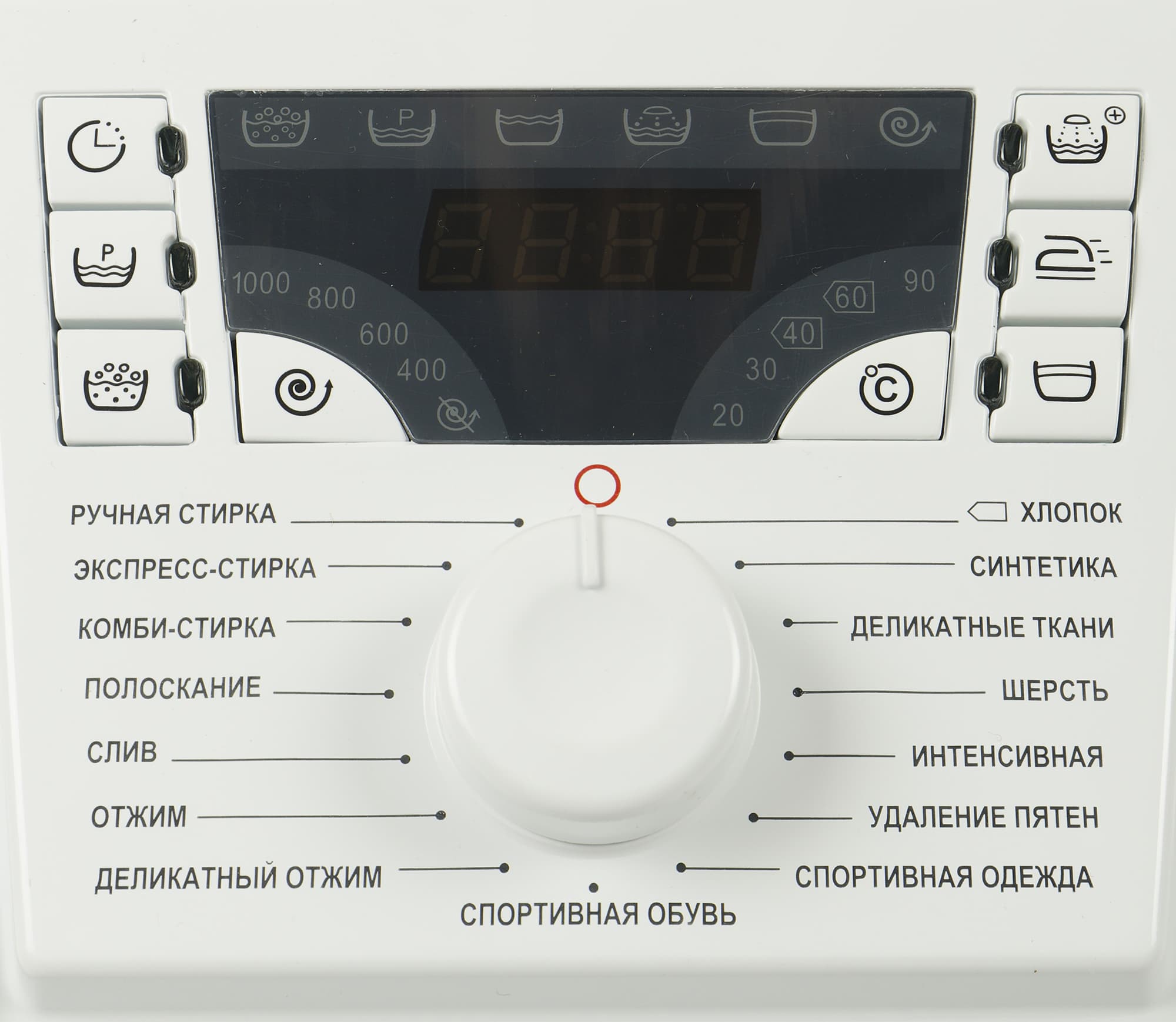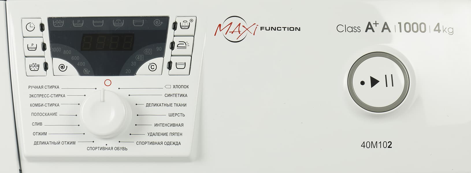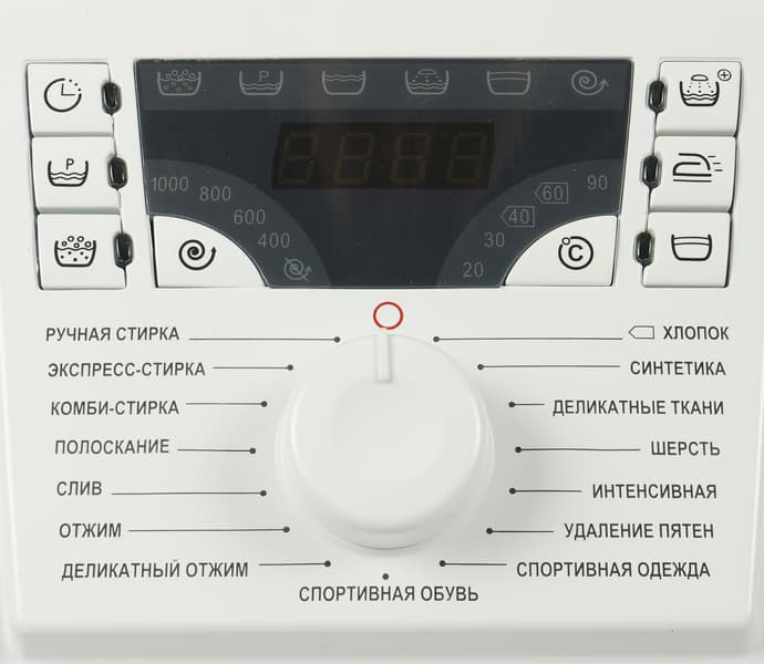 Панель управления с дисплеем, кнопками выбора дополнительных опций и селектором программ находится по центру верхней части лицевой стороны машины. Справа — круглая кнопка «Старт/Пауза».