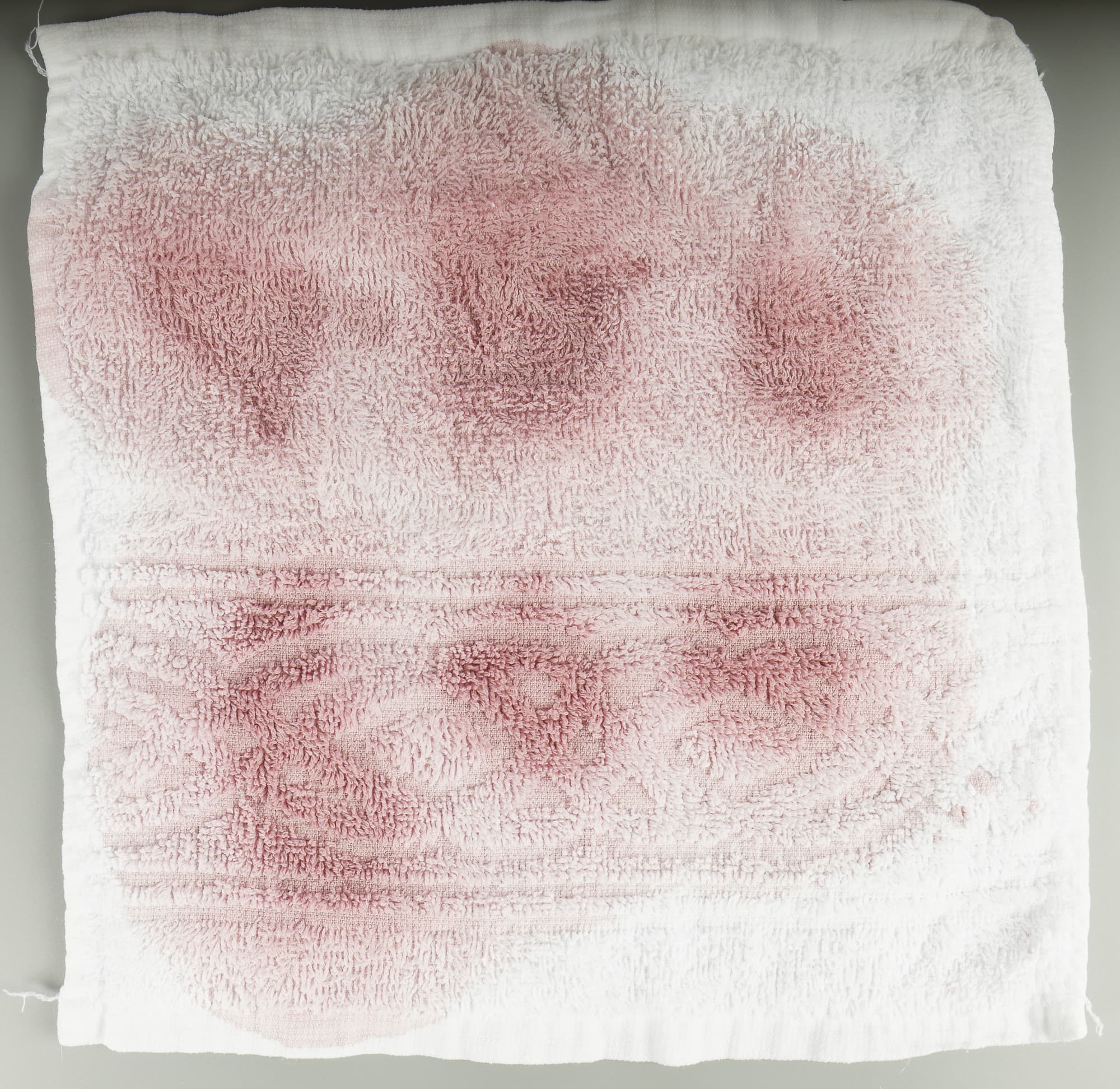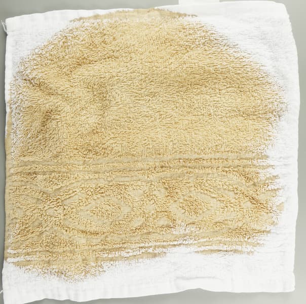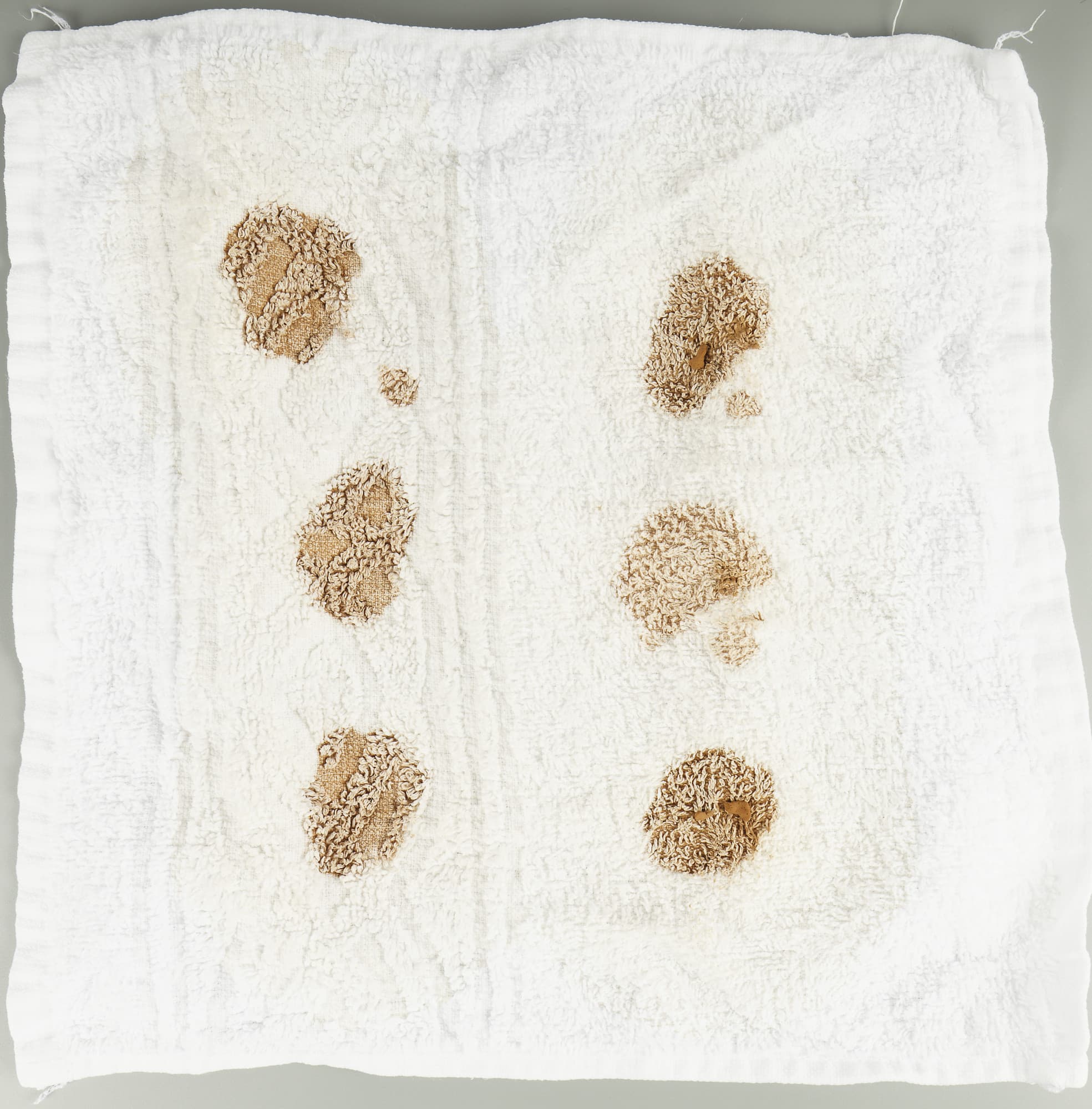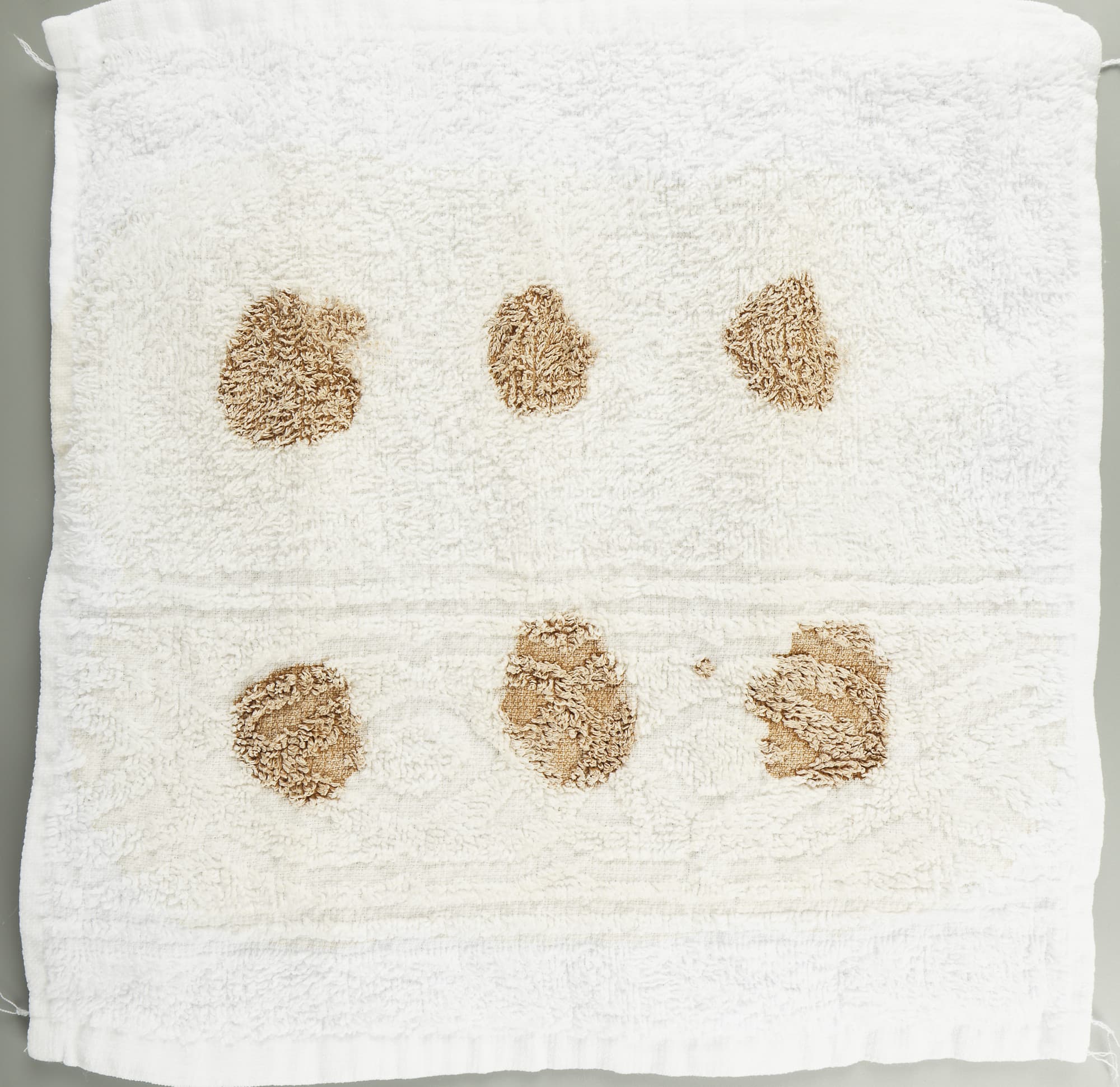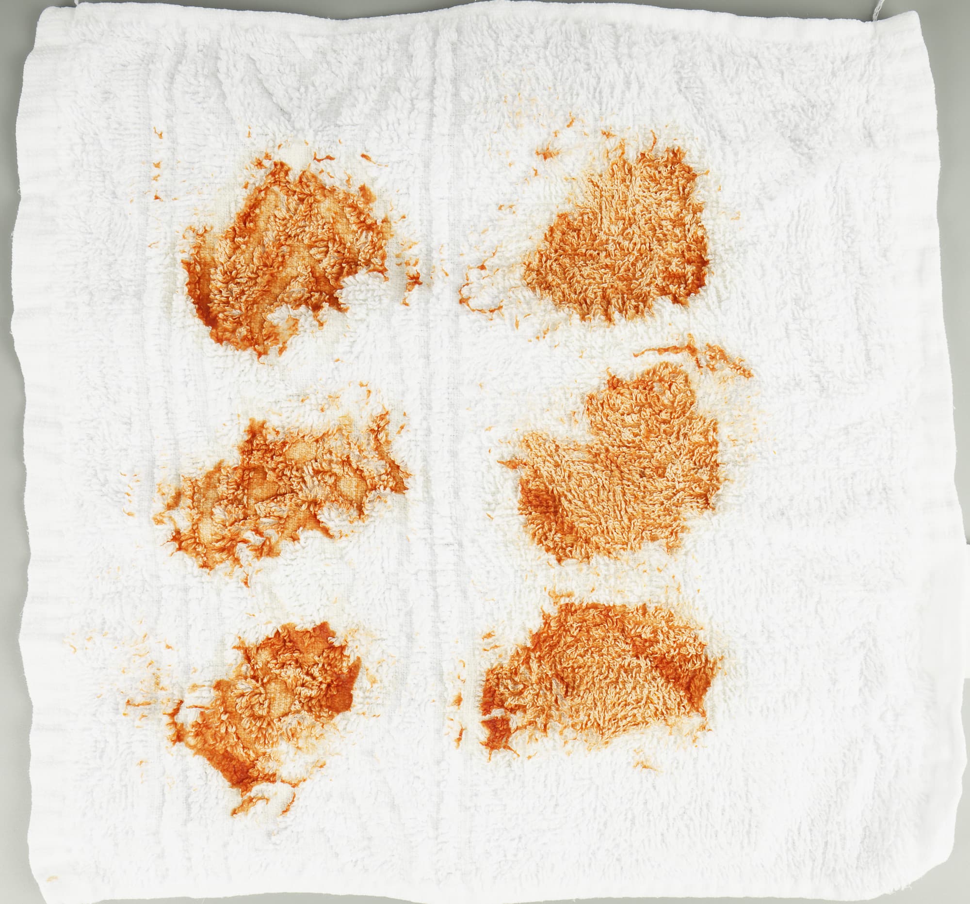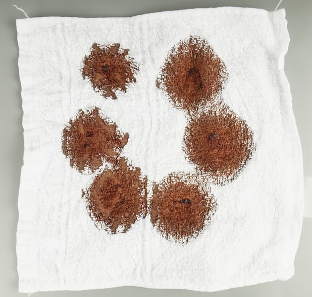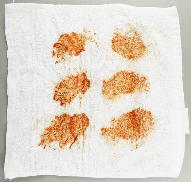 Этими жидкостями мы обработали (то есть выпачкали) белые махровые салфетки. На каждую нанесли несколько пятен своего вещества — чтобы лучше проиллюстрировать тест. Затем сутки абстрактная живопись украшала тестовую лабораторию при комнатной температуре и только после этого отправилась в стирку.