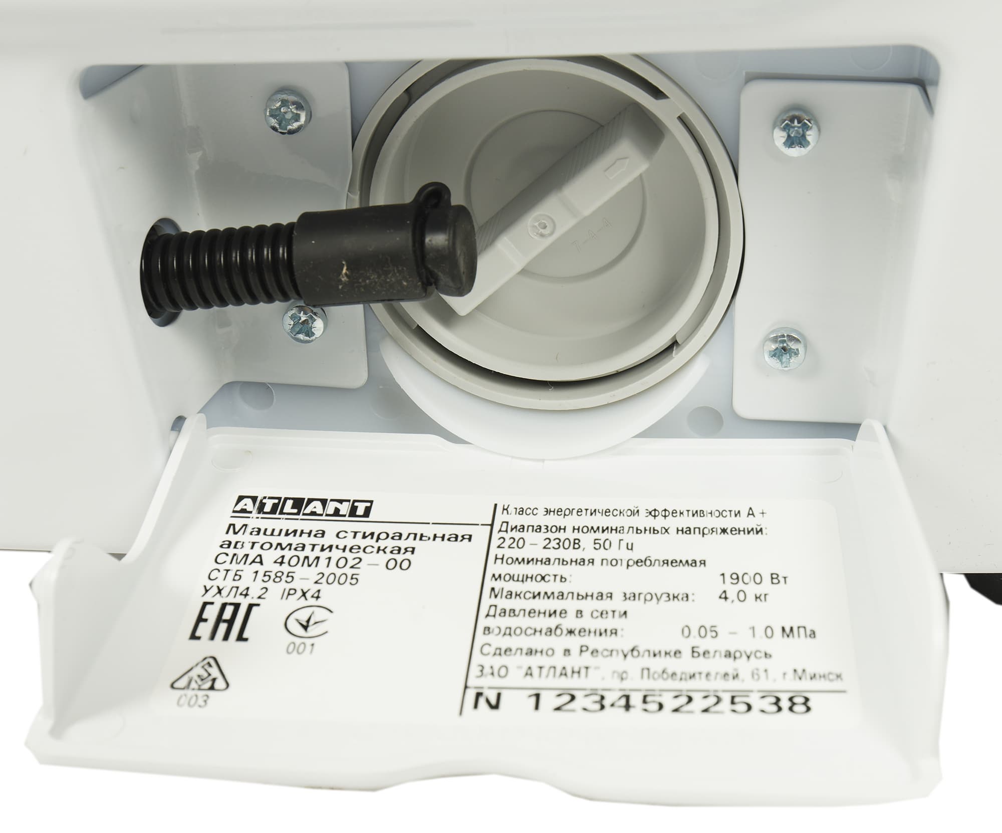 Лючок фильтра размещен в правом нижнем углу передней панели. На внутренней стороне крышки можно прочитать серийный номер изделия, данные изготовителя и краткую техническую информацию.