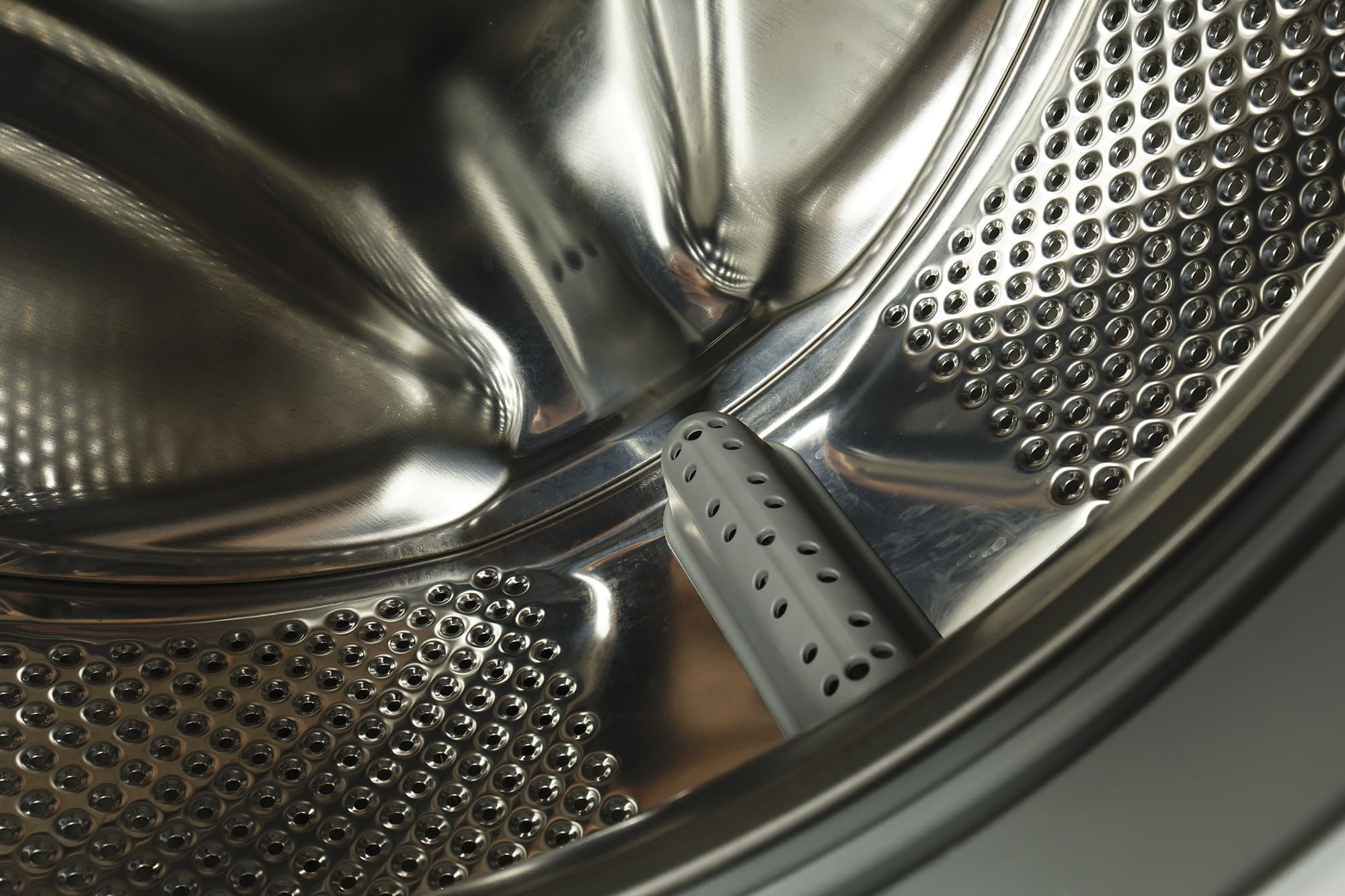 Стенки барабана равномерно перфорированы, дополнительных выштамповок на них нет. Пластиковые бойники, перемешивающие белье, прямые — без каких-либо гидродинамических хитростей.