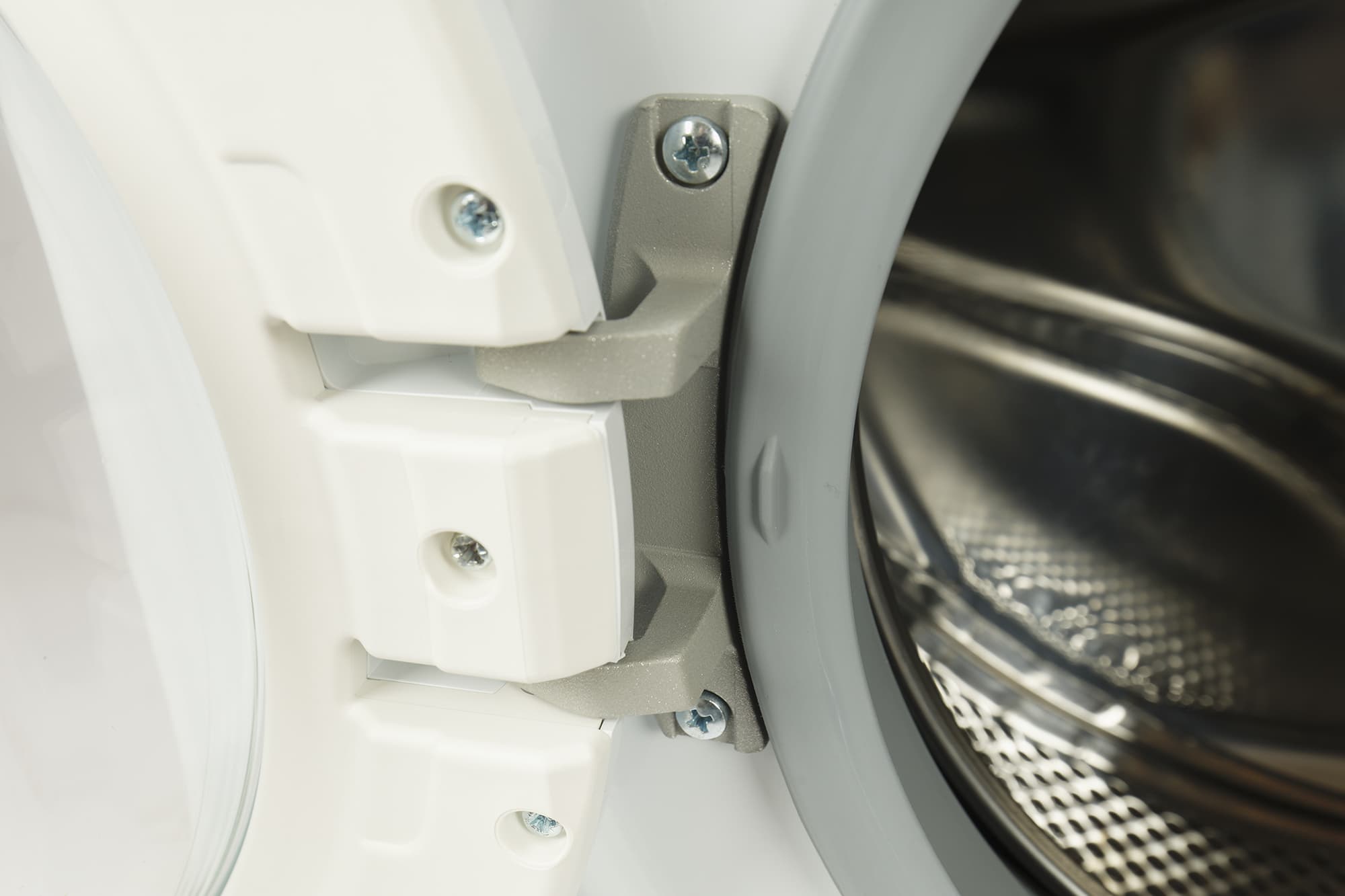 Окно крышки люка стеклянное, а сама крышка крепится на пластиковой петле. Открывается она в привычную левую сторону.