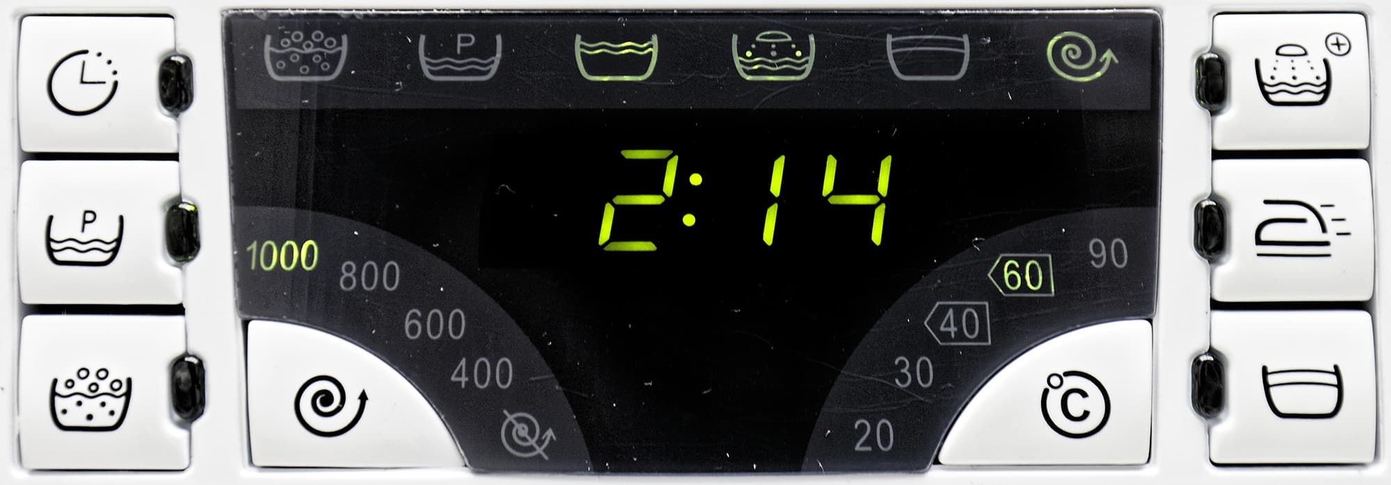 На цифровом экране выводится продолжительность цикла стирки. Слева и справа от него располагаются кнопки выбора скорости отжима и температуры, а символы в верхней части подсвечивают выбранные опции.