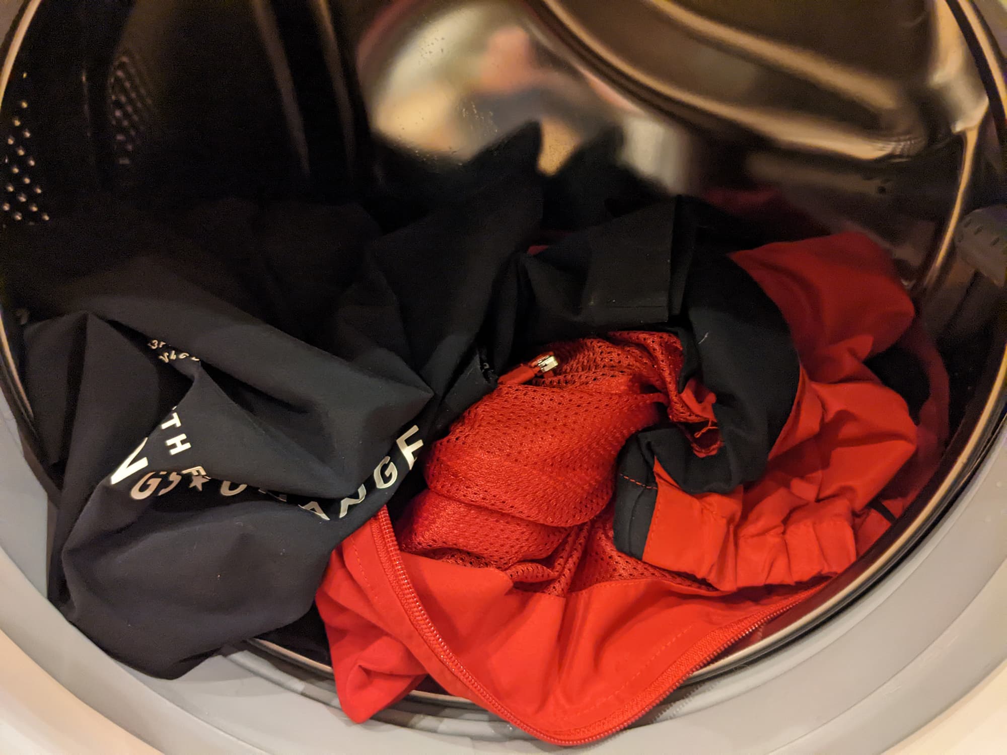 Костюм для физкультуры (куртка, штаны и футболка) отлично отстирался за изначально заявленные машиной 1 час и 6 минут. Штатной интенсивности отжима (800 об/мин) вполне достаточно для синтетической ткани.