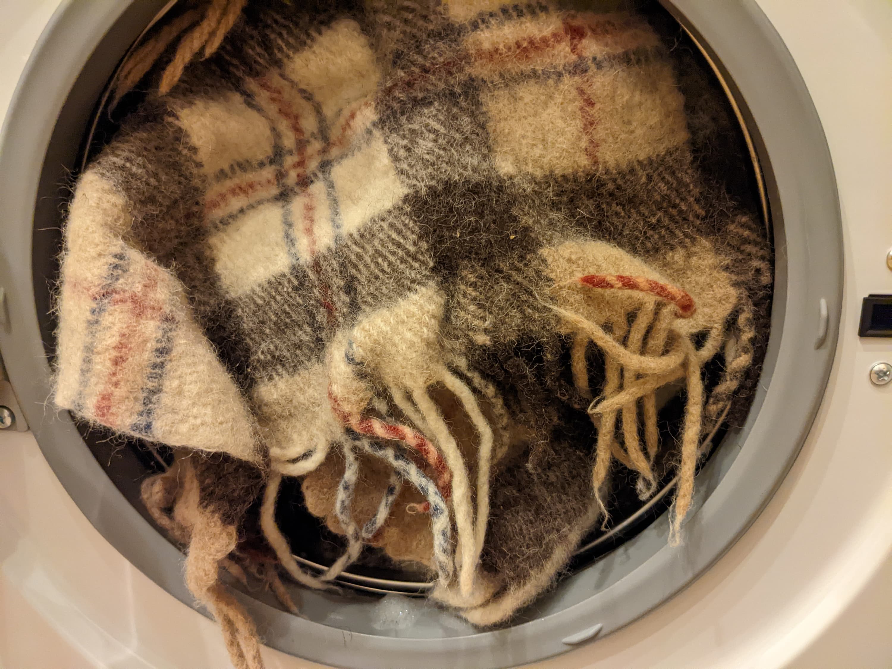В миниатюрные стиралки, как и в большие, попадают не только хлопок и лен, но и более деликатные ткани. Например, всегда интересно, как машина справится с шерстью. Мы взяли наш старый добрый плед весом чуть меньше килограмма и выбрали для него соответствующую программу с установками по умолчанию (30 °C, отжим 400 оборотов в минуту), а также специальное жидкое средство.