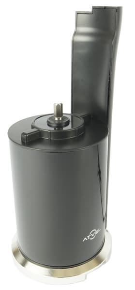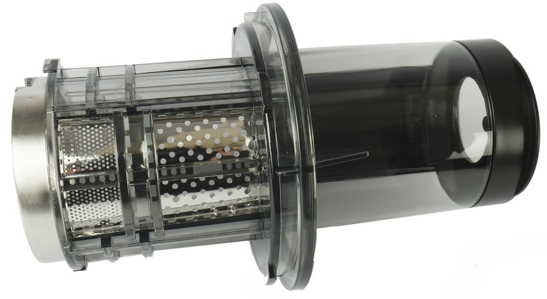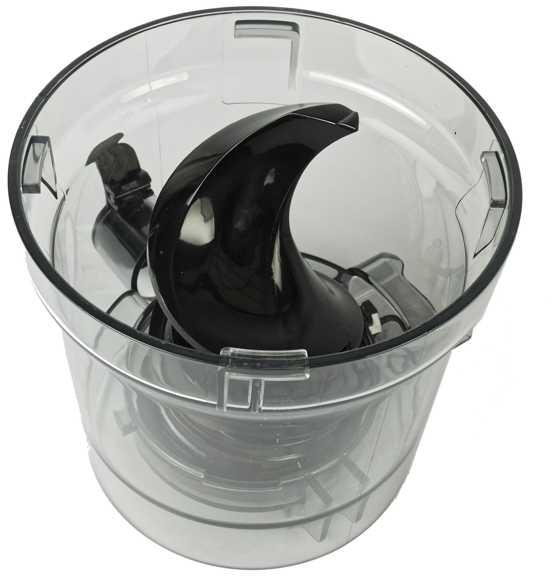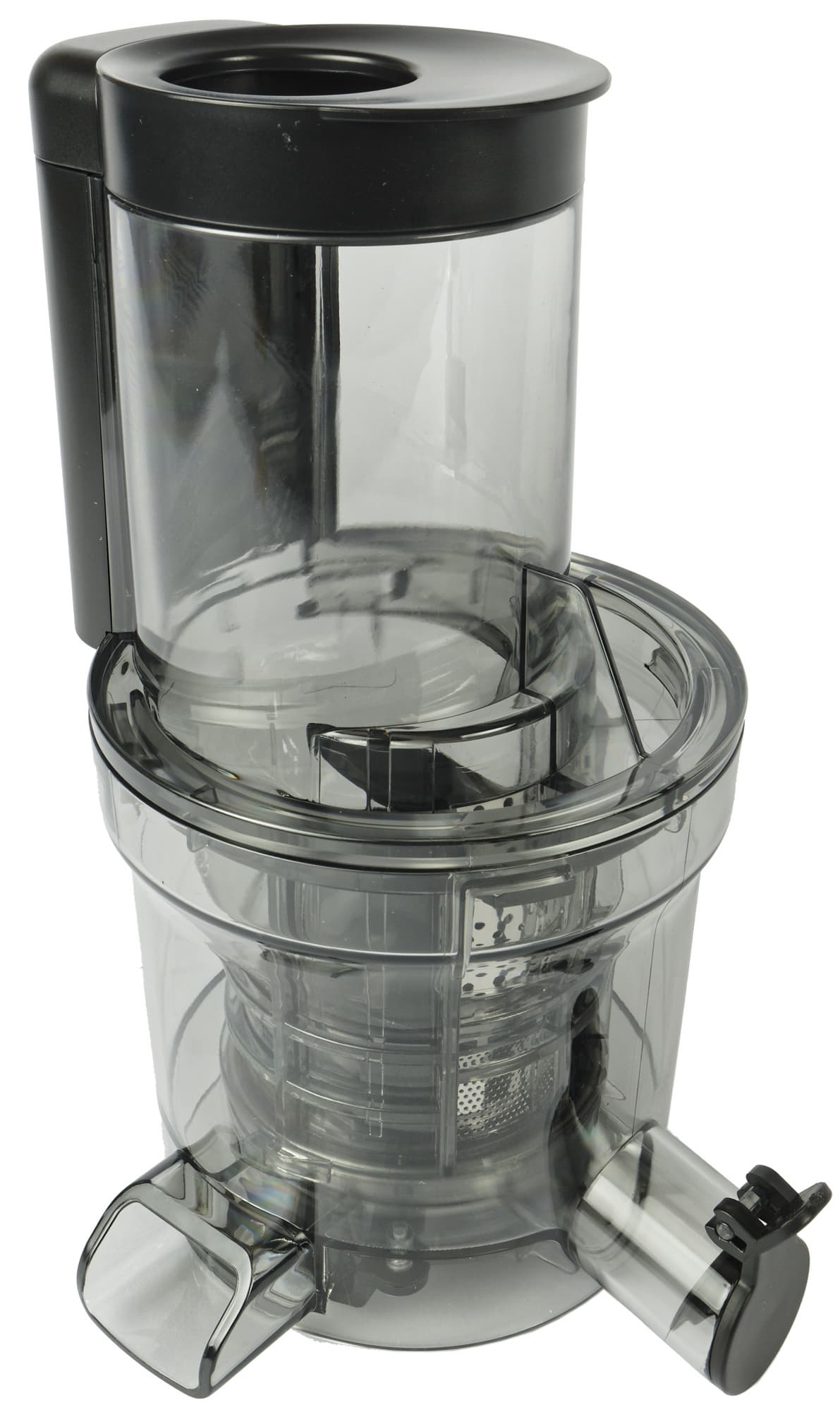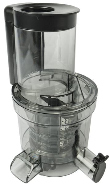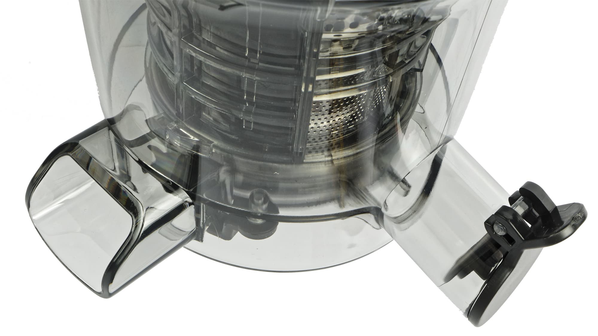 На моторный блок устанавливается резервуар, в котором во время отжима происходит разделение сока и жмыха. Отверстие для выхода отходов со стороны чаши закрывается резиновым язычком. С правой стороны резервуара из цилиндрического носика выливается сок. Канал выхода сока оснащен противокапельной крышкой с силиконовой прокладкой.