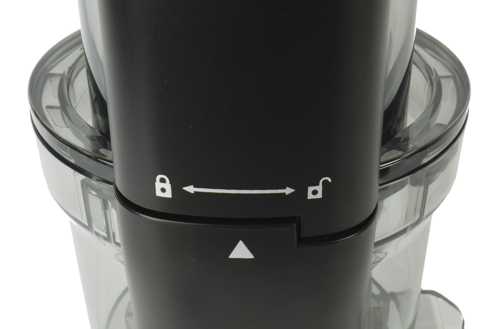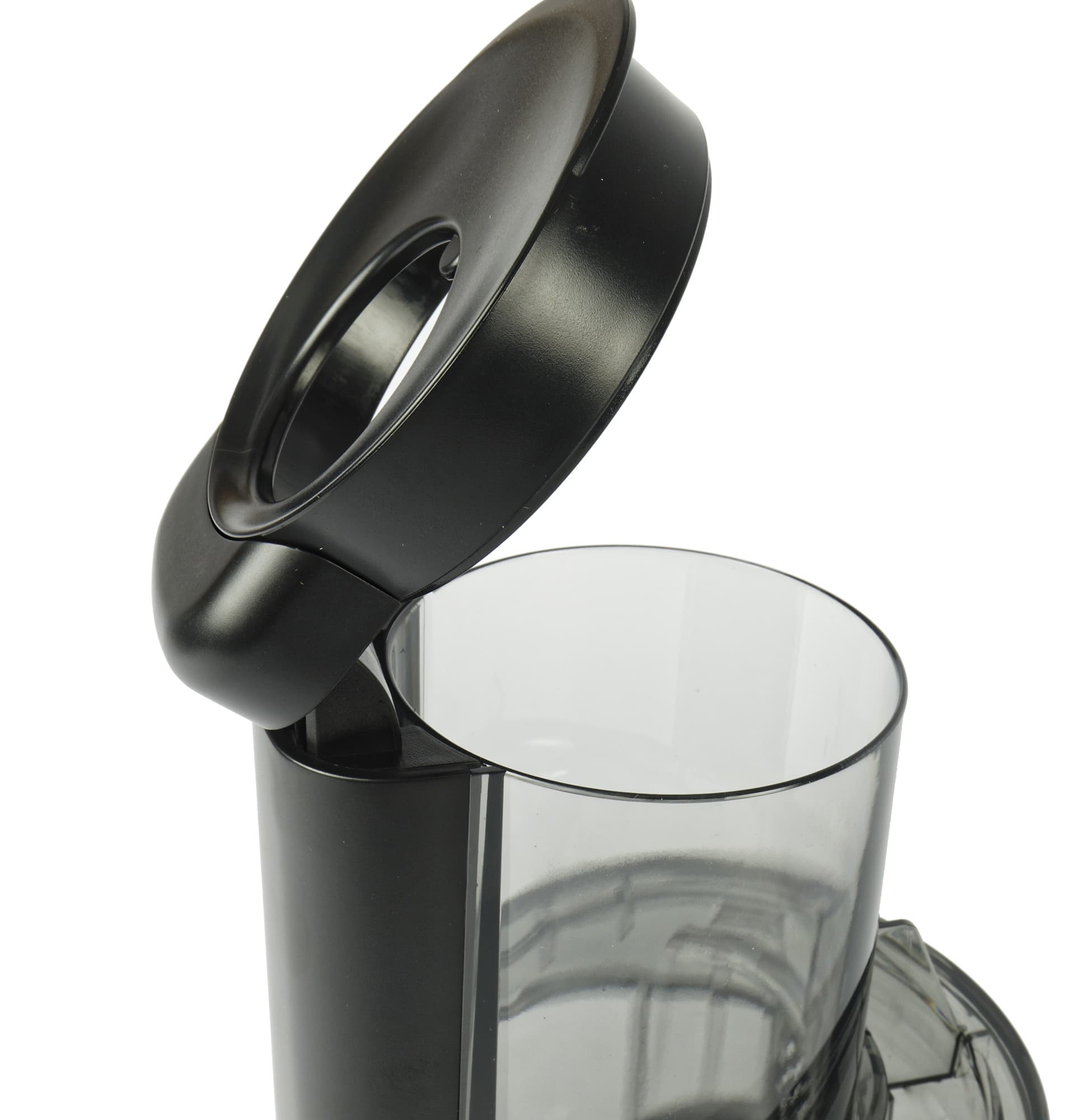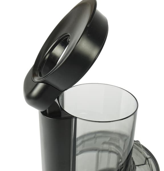 Отжимной блок соковыжималки прозрачный, что позволяет следить за процессом. Отверстие в крышке загрузочной горловины совсем небольшое и плоды придется нарезать минимум на 4, а то и на 6 частей. Если в процессе поднимать крышку, то в саму горловину диаметром почти 8 см помещаются дольки гораздо крупнее, а в некоторых случаях и целые плоды, но после загрузки каждой порции придется опускать крышку и так раз за разом, как мы помним, иначе шнек не крутится. Механизм простой, никаких усилий не требует и неудобств эти действия не приносят.