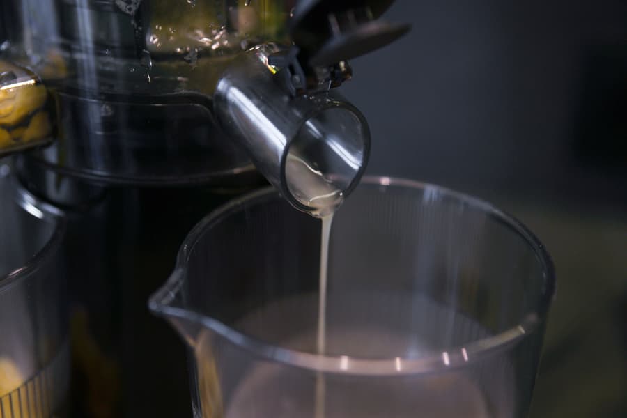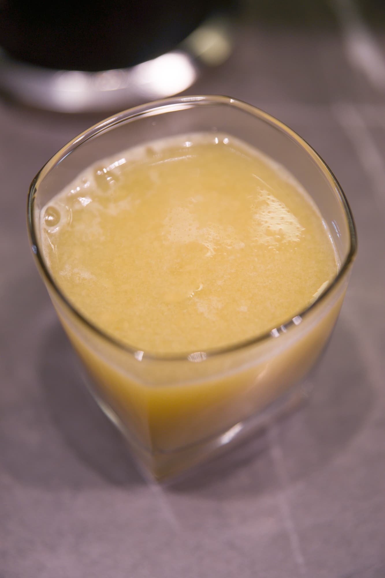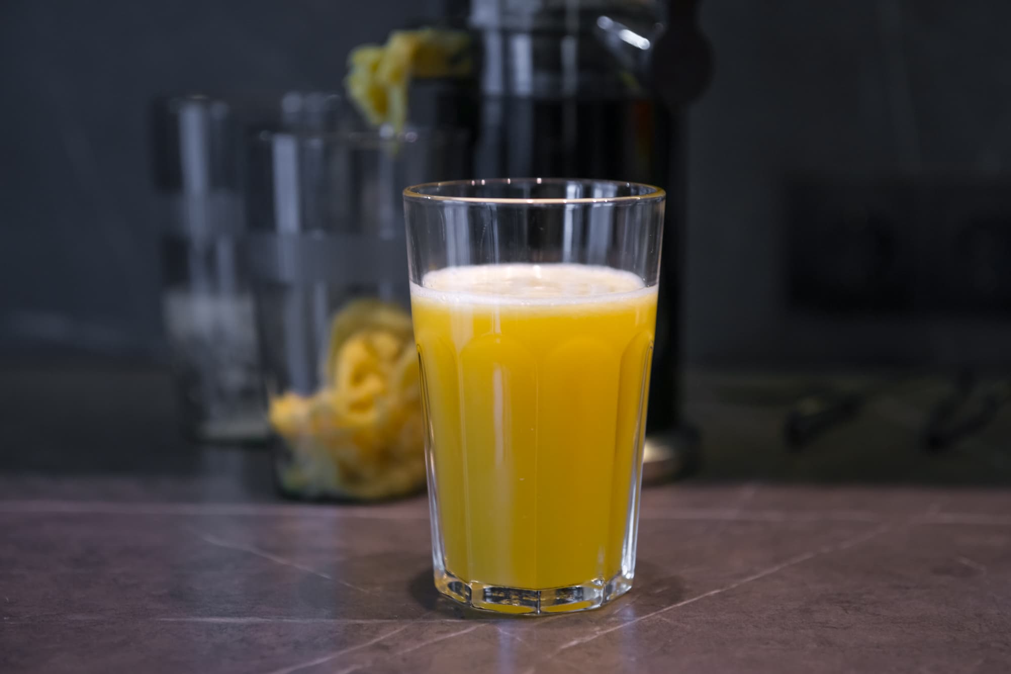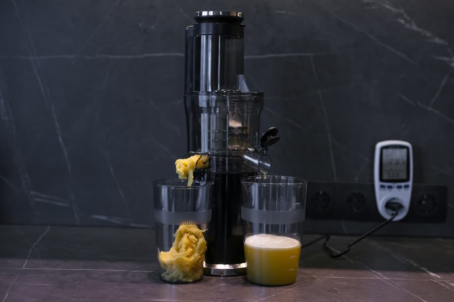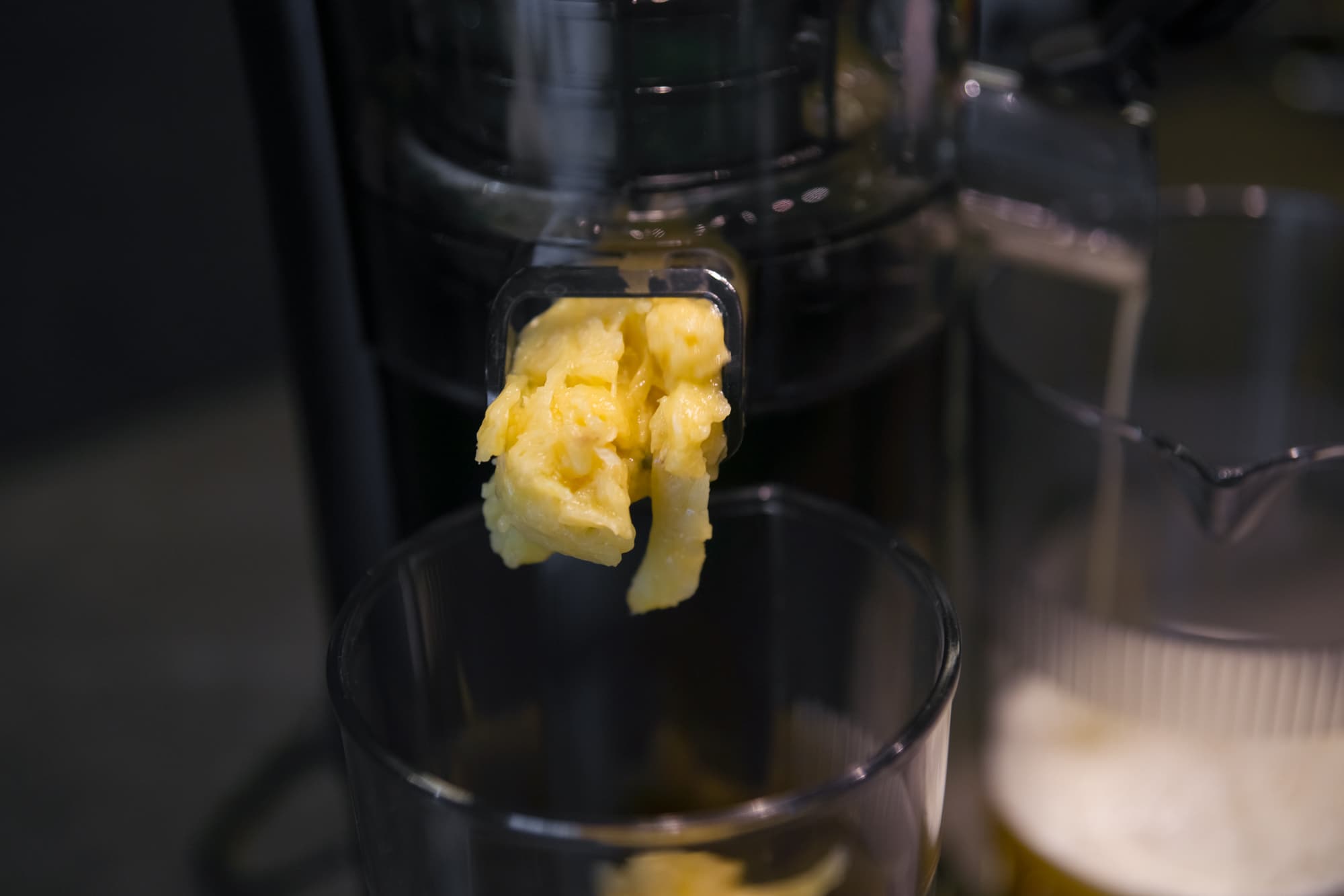 В этом тесте, ожидаемо, никаких сложностей в обработке фрукта не было. Дольки без задержек перемалывались, жмых аккуратно падал в контейнер, сок быстро наполнял емкость.