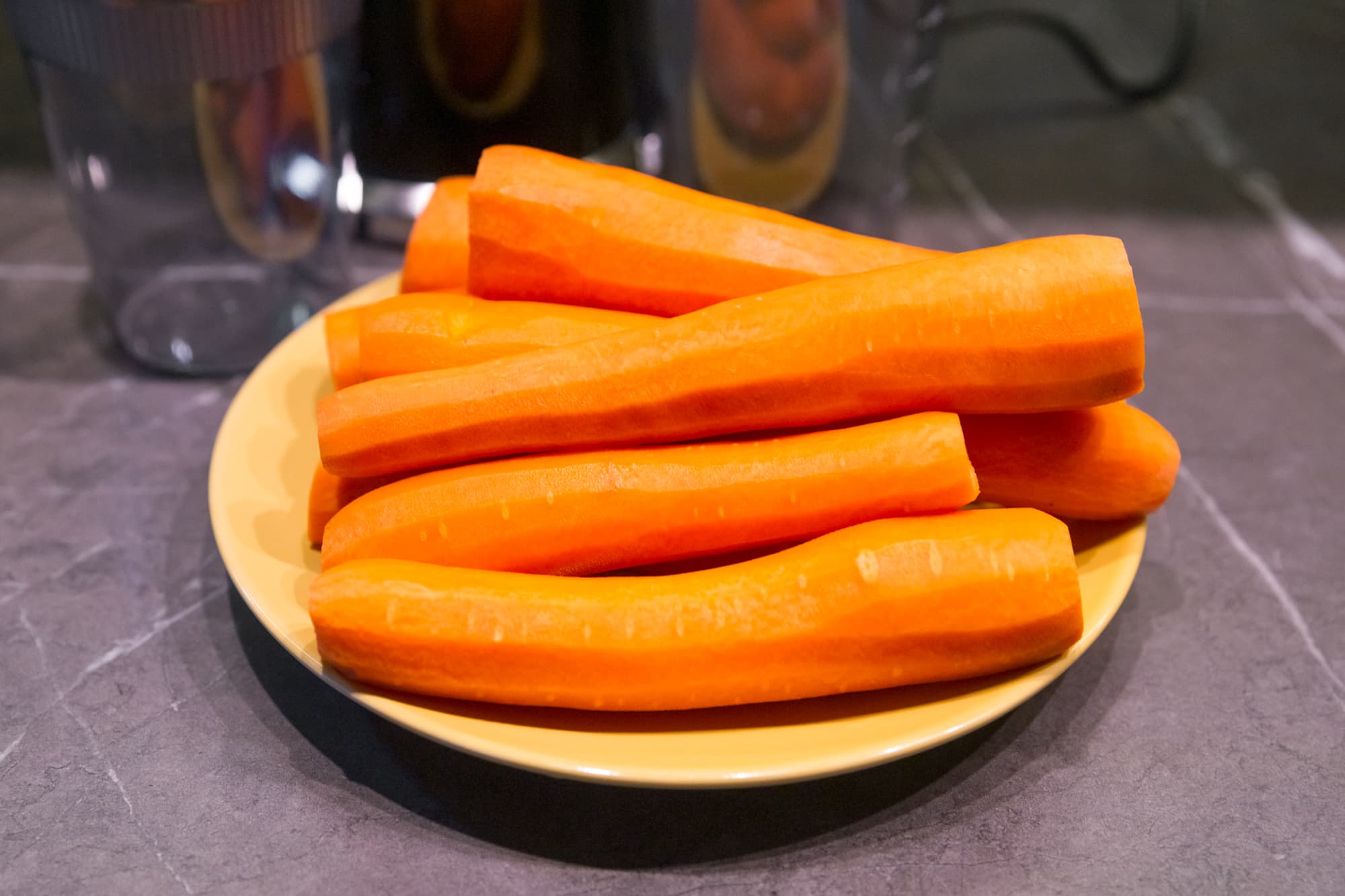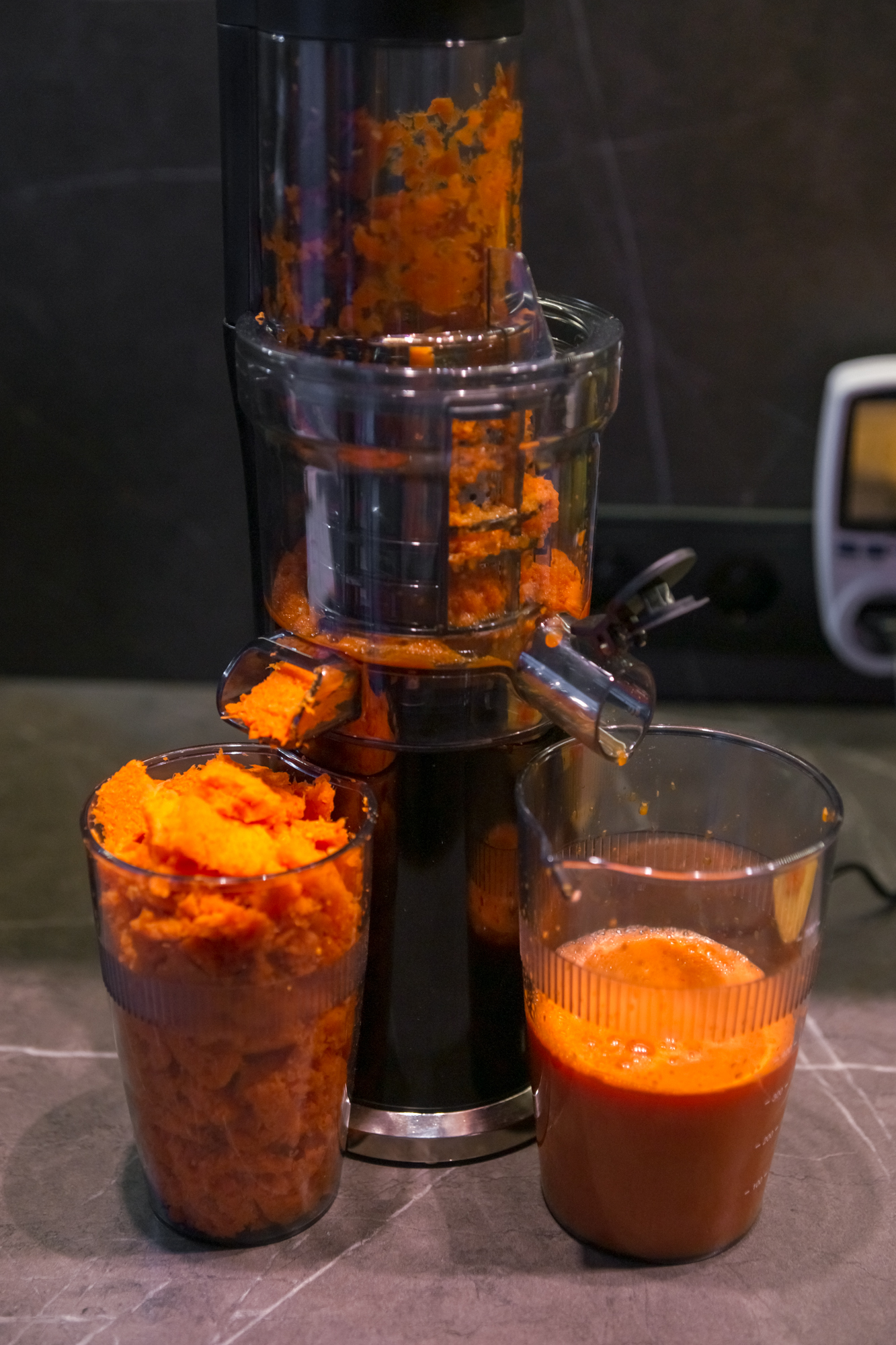 Морковки разрезали на 2-3 части и запускали одну за другой, едва дождавшись, когда первая уйдет в шнек хотя бы наполовину. Корнеплоды трещали, а соковыжималка спокойно и планомерно пережимала их в густой плотный сок.