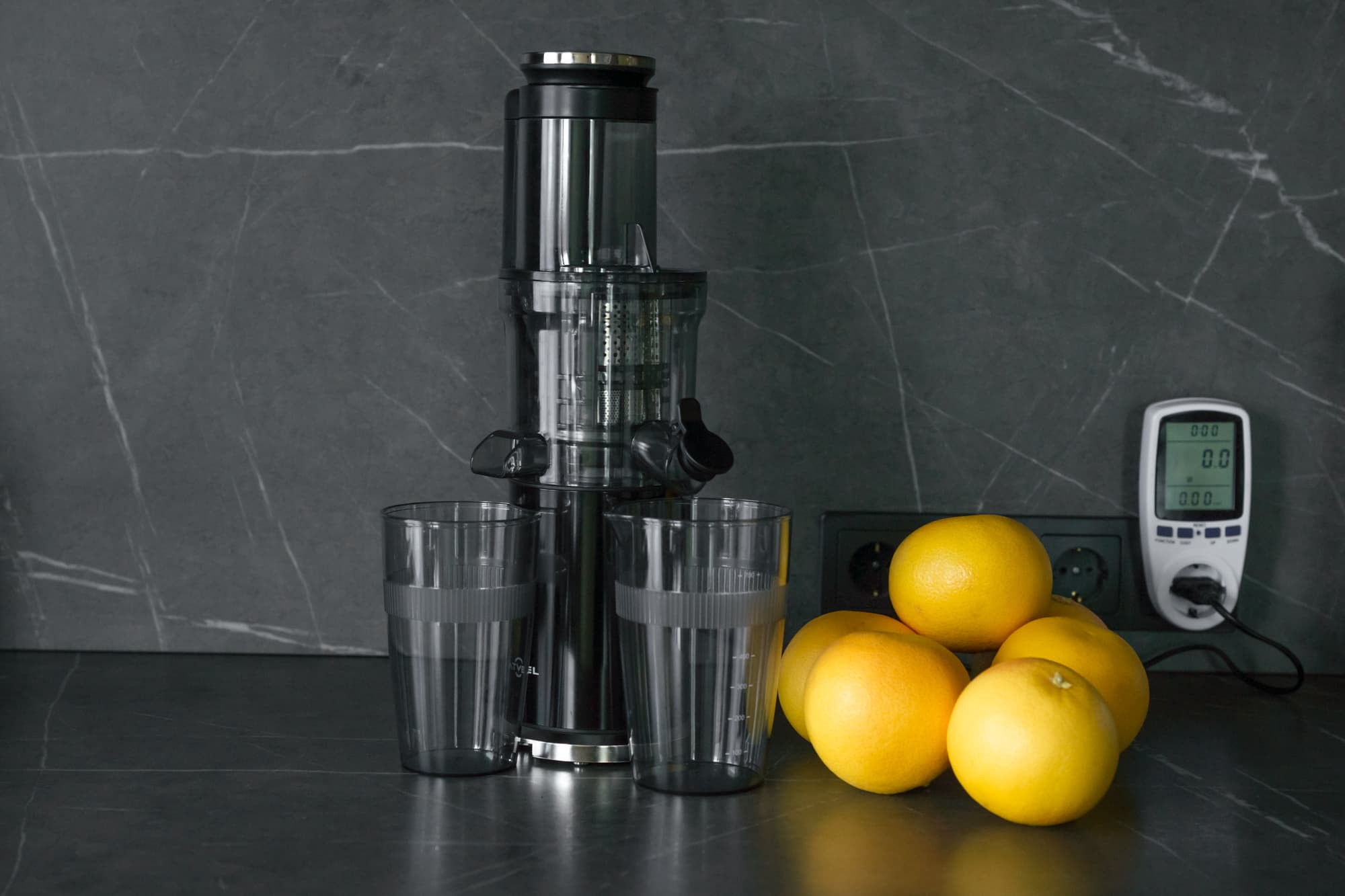 Скорость отжима не самая высокая, но количество и качество готового напитка мы оцениваем положительно. Прибор отлично проявил себя в работе с разными по жесткости продуктами, и мы смело можем рекомендовать его для повседневного домашнего использования. Из плюсов отметим также невозможность запустить устройство в неправильной сборке, отсутствие частиц жмыха, вылетающих за пределы контейнера для отходов, и противокапельную систему, реализованную в виде клапана с силиконовой накладкой на носике для выхода сока.